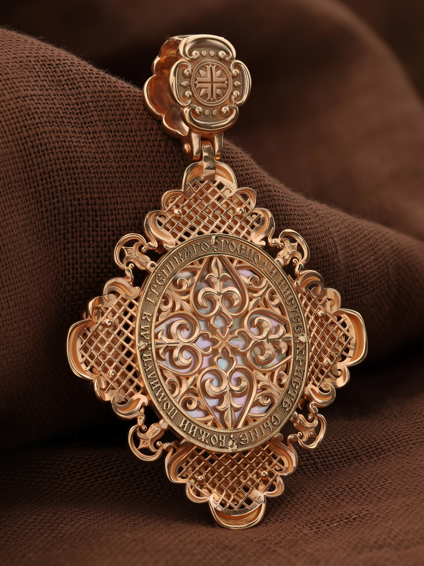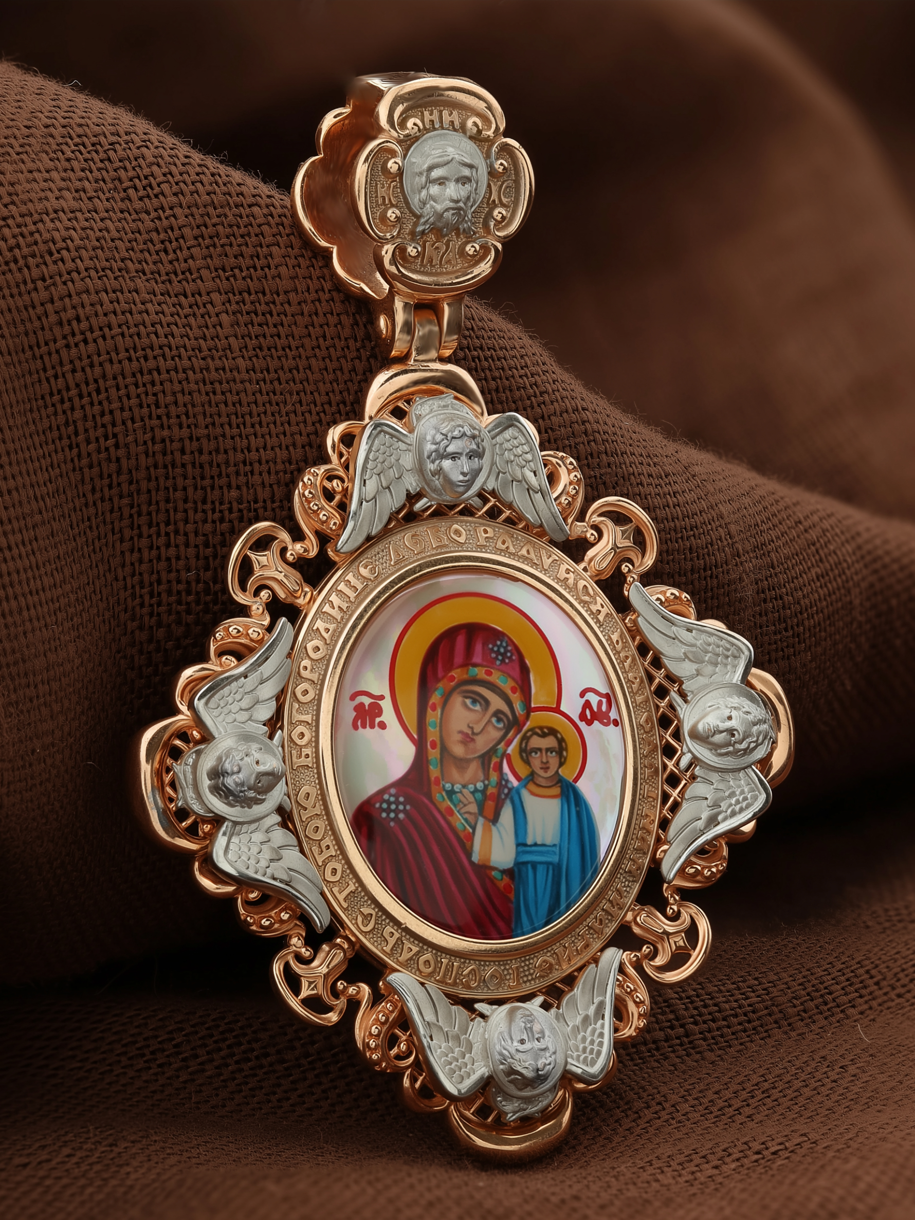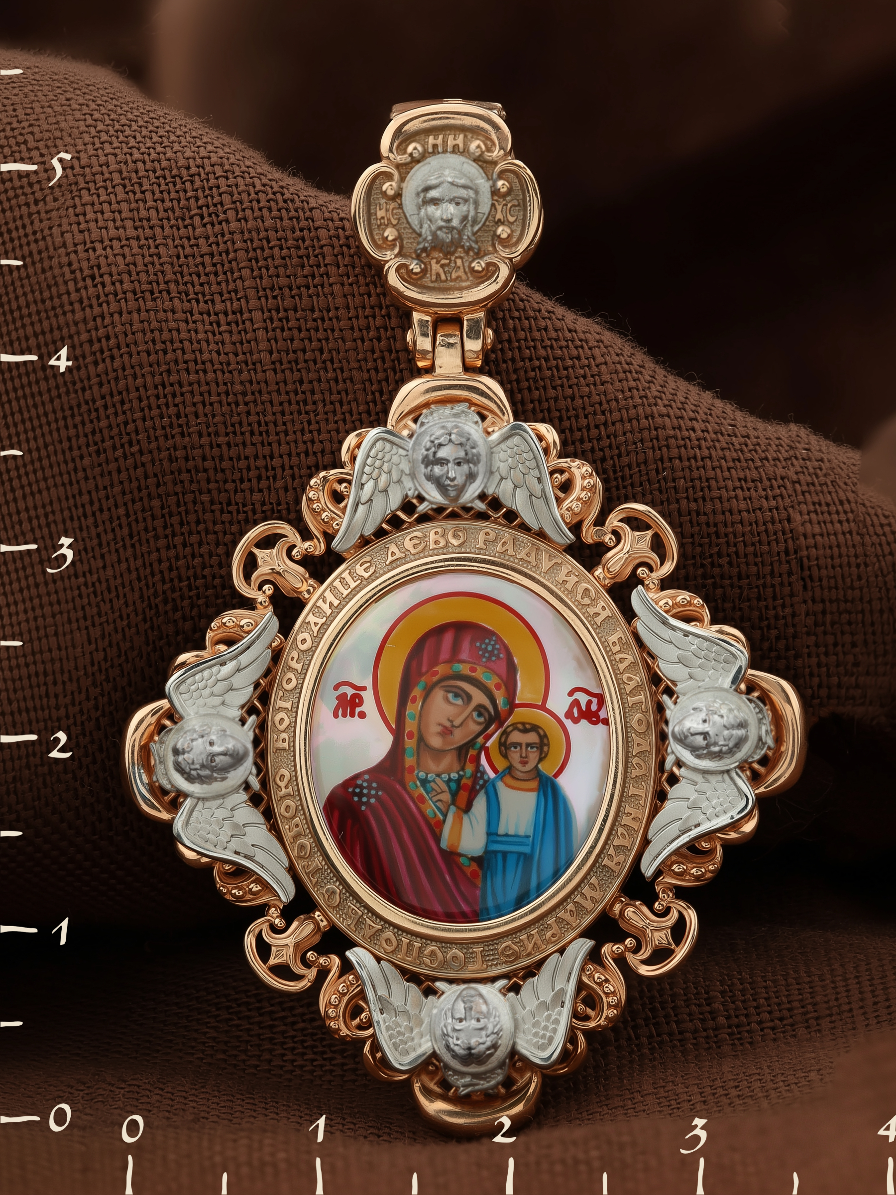 На лицевой стороне образка изображена Казанская икона Божией Матери. Пресвятая Богородица — милосердная заступница, просительница за нас перед Богом. Она стала воистину нашей Матушкой, охраняющей и поддерживающей нас от рождения до самой смерти, а Ее благодатная помощь изливается на нас по молитвам у ее чудотворных икон. Казанская икона явилась в 1579 году в Казани, вскоре после взятия Казанского царства у татар Иоанном Грозным. Этот образ Богородицы не раз сопровождал русский народ в бедствиях. Икона Божией Матери Казанская вдохновляла русских ратников в период Смутного времени при освобождении Москвы от поляков. Перед Казанской иконой в 1709 году, накануне Полтавской победы, император Петр I молился о даровании победы русскому войску. В 1812 году накануне отъезда в действующую армию перед чудотворной иконой Божией Матери молился князь Михаил Кутузов. Не только государственным мужам и дружинам указывала путь икона — по доброй традиции именно этой иконой благословляют на брак молодых родители, длинным списком чудес сопровождается этот образ Богоматери — один из самых любимых на Руси. Существует множество древних списков с этой удивительной иконы.