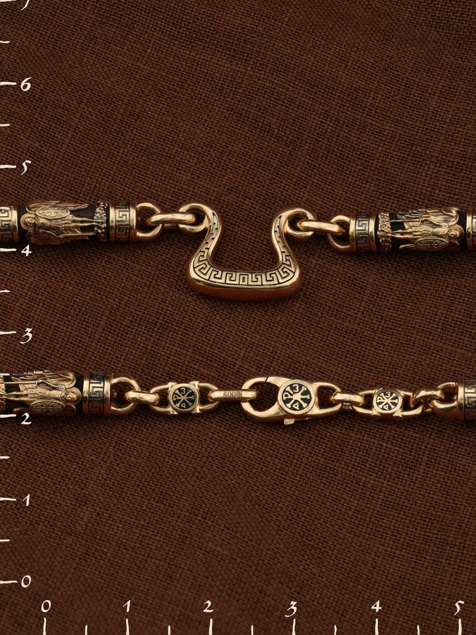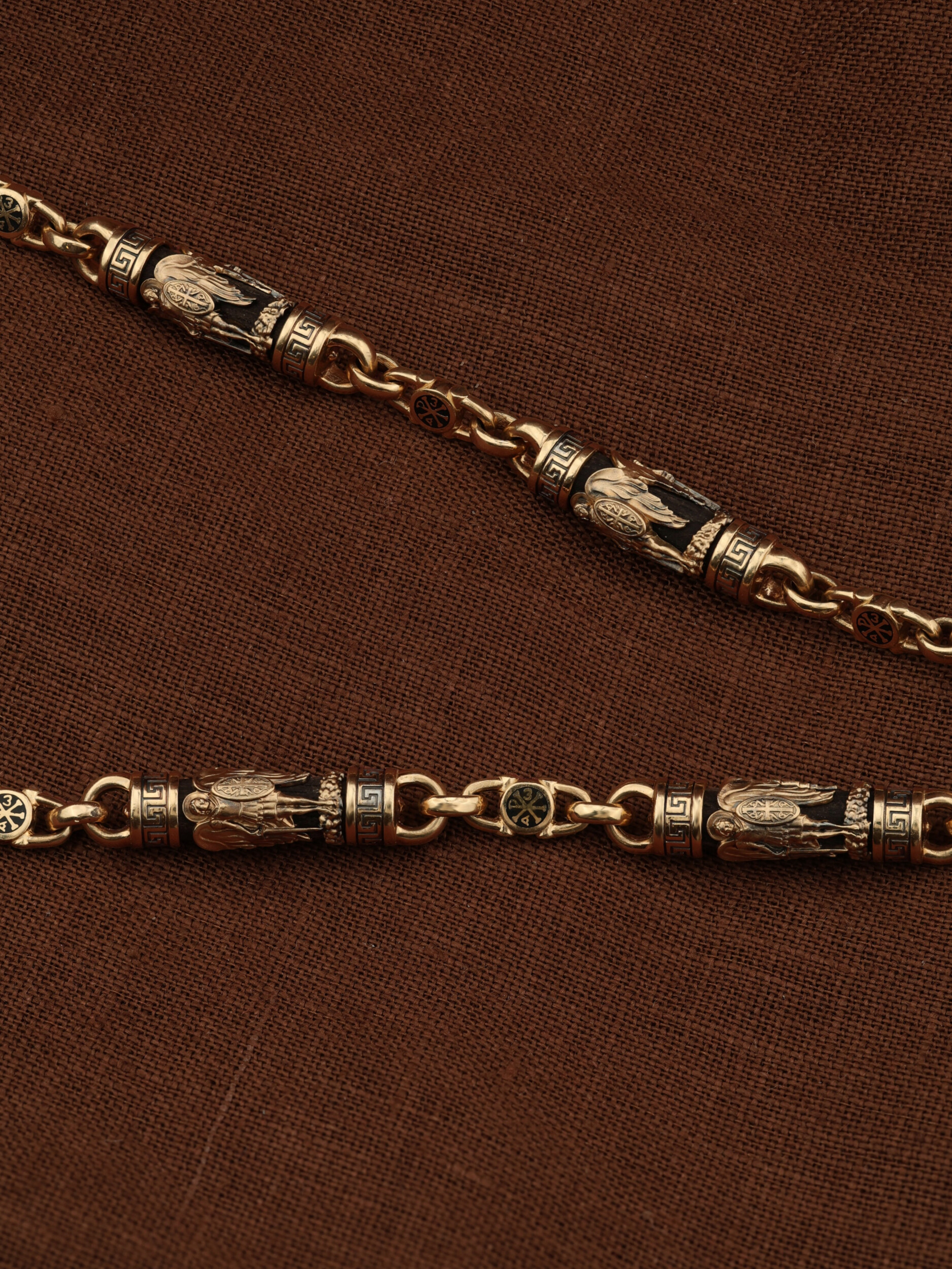 На звеньях цепи изображена Хризма — монограмма имени Христа, которая состоит из двух начальных греческих букв имени  — Х (хи) и Р (ро), скрещённых между собой. По краям монограммы помещены греческие буквы a и w. Такое употребление этих букв восходит к тексту Апокалипсиса: «Аз есмь Альфа и Омега, начало и конец, говорит Господь, Который есть и был и грядет, Вседержитель.» (Откр. 1:8; см. также Откр. 22:13). Также на звеньях изображен Святой Ангел-Хранитель в виде прекрасного юноши держащего в правой руке мечь, а в левой — щит. Ангел-Хранитель — это Ангел приставляемый Богом к человеку при крещении для охраны и помощи в добрых делах. Он невидимо находится при человеке на протяжении всей его жизни, если человек сохраняет в себе любовь к Богу и истинную веру перед Ним. Ангел-Xранитель делают для нас все, что служит к истинному нашему благу и спасению. Невидимо пребывая при нас постоянно, он, руководствуя нас ко спасению, не только по нашему желанию таинственно наставляет нас на все доброе и полезное, не только возносит наши молитвы к Богу, но еще и сам от себя охраняют и защищают нас от врагов видимых и невидимых и ходатайствует за нас пред Богом. Ангел-Хранитель так любит нас, как никто на земле любить не может. Одного лишь каждому из нас он желает — спасения души; к этому он направляет все свои заботы. И если видит нас также заботящимися о спасении, радуется, если же видит нас пребывающими в нерадении о душе своей, скорбит. Но и самый великий грешник может примириться со своим Ангелом-Хранителем посредством искреннего раскаяния в грехах и оставления их навсегда. В таком случае, по слову Писания, великая радость бывает для всех ангелов на небесах (Лк. 15:10). Цепь украшена орнаментом.
