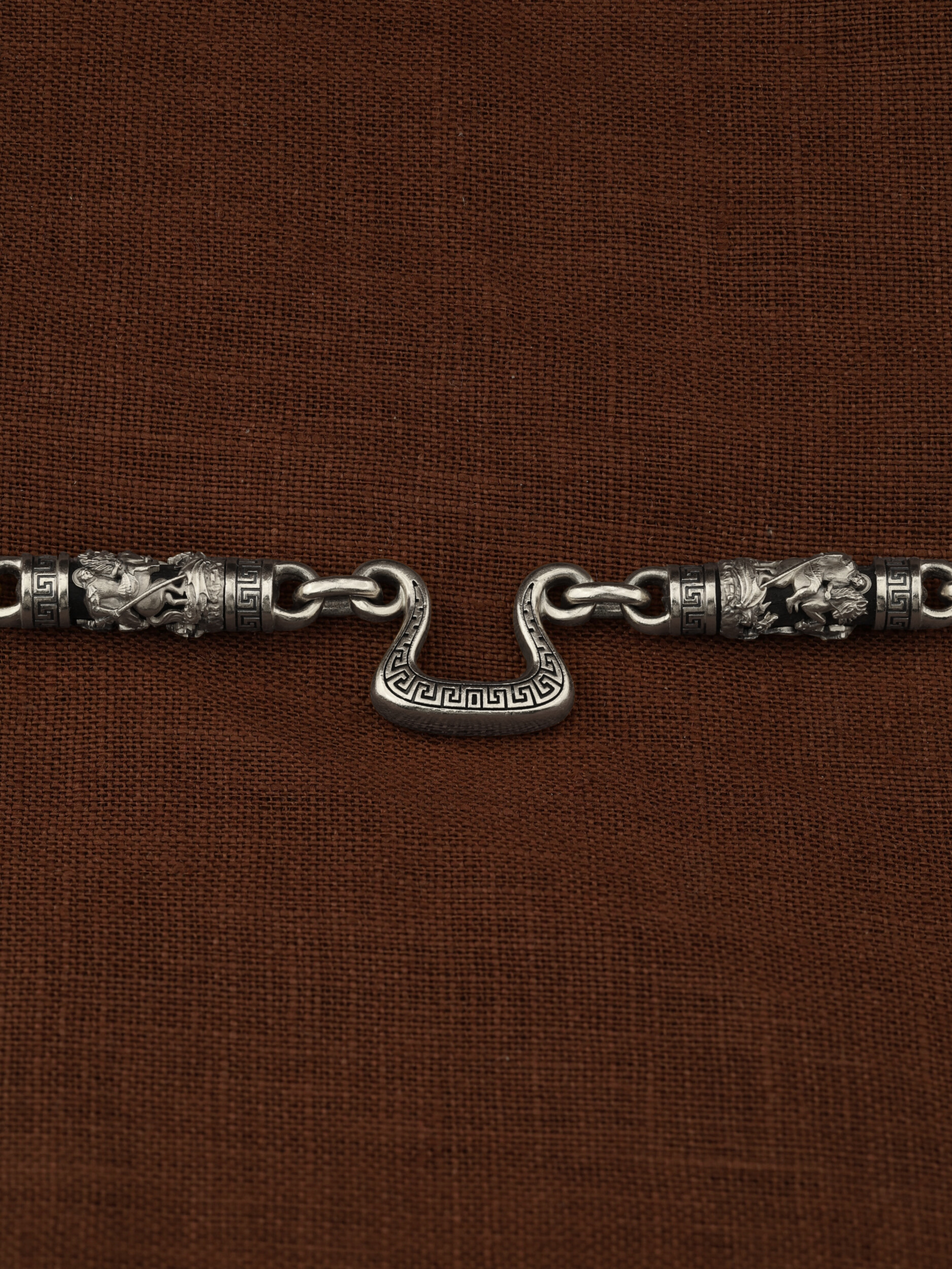 На звеньях цепи изображена Хризма — монограмма имени Христа, которая состоит из двух начальных греческих букв имени — Х (хи) и Р (ро), скрещённых между собой. По краям монограммы помещены греческие буквы a и w. Такое употребление этих букв восходит к тексту Апокалипсиса: «Аз есмь Альфа и Омега, начало и конец, говорит Господь, Который есть и был и грядет, Вседержитель.» (Откр. 1:8; см. также Откр. 22:13). Также на звеньях цепи помещено изображен святого великомученика Георгия Победоносца — одного из самых почитаемых и удивительных святых. Георгий родился в Каппадокии (Малая Азия) в семье богатых и знатных горожан. Юношей поступил на службу к римскому императору Диоклетиану, за отличное знание военного дела и проявленную в боях и походах храбрость был приближен к императору и удостоен высокого воинского звания. Во время начавшихся гонений на христиан, перешел на сторону гонимых и, отвергнув человеческий страх, стал ярым проповедником учения Христа. Мучители подвергли опального воеводу жесточайшим восьмидневным пыткам и казнили его (обезглавили) в возрасте около тридцати лет в 303 году. На Руси он известен как Юрий или Егорий, заступник для верующих, чья жизнь имеет какое-либо отношение к военным делам, помощник в крестьянском труде. На цепи Георгий изображен как воитель, сидящий на вздыбленном коне и поражающий копьем огнедышащего змея. Змей символизирует собою сатанинские силы. Молитвами вознесенными к Всевышнему и своей непреклонной верой он смог одолеть чудовище. Святой убил змея, спас царскую дочь, принесенную в жертву, и жителей города, их души от влияния дьявола, породив в них надежду и веру в Господа, призывая людей принять христианскую веру. Цепь украшена орнаментом.