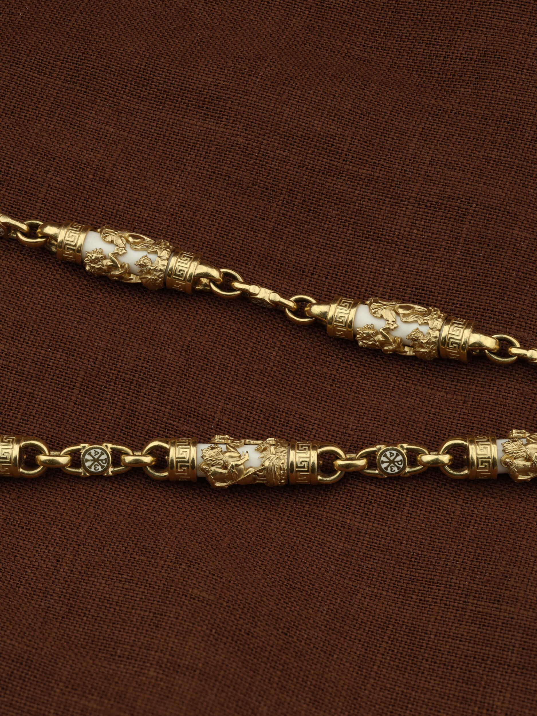 На звеньях цепи изображена Хризма — монограмма имени Христа, которая состоит из двух начальных греческих букв имени  — Х (хи) и Р (ро), скрещённых между собой. По краям монограммы помещены греческие буквы a и w. Такое употребление этих букв восходит к тексту Апокалипсиса: «Аз есмь Альфа и Омега, начало и конец, говорит Господь, Который есть и был и грядет, Вседержитель.» (Откр. 1:8; см. также Откр. 22:13). Также на звеньях цепи помещено изображен святого великомученика Георгия Победоносца — одного из самых почитаемых и удивительных святых. Георгий родился в Каппадокии (Малая Азия) в семье богатых и знатных горожан. Юношей поступил на службу к римскому императору Диоклетиану, за отличное знание военного дела и проявленную в боях и походах храбрость был приближен к императору и удостоен высокого воинского звания. Во время начавшихся гонений на христиан, перешел на сторону гонимых и, отвергнув человеческий страх, стал ярым проповедником учения Христа. Мучители подвергли опального воеводу жесточайшим восьмидневным пыткам и казнили его (обезглавили) в возрасте около тридцати лет в 303 году. На Руси он известен как Юрий или Егорий, заступник для верующих, чья жизнь имеет какое-либо отношение к военным делам, помощник в крестьянском труде. На цепи Георгий изображен как воитель, сидящий на вздыбленном коне и поражающий копьем огнедышащего змея. Змей символизирует собою сатанинские силы. Молитвами вознесенными к Всевышнему и своей непреклонной верой он смог одолеть чудовище. Святой убил змея, спас царскую дочь, принесенную в жертву, и жителей города, их души от влияния дьявола, породив в них надежду и веру в Господа, призывая людей принять христианскую веру. Цепь украшена орнаментом.