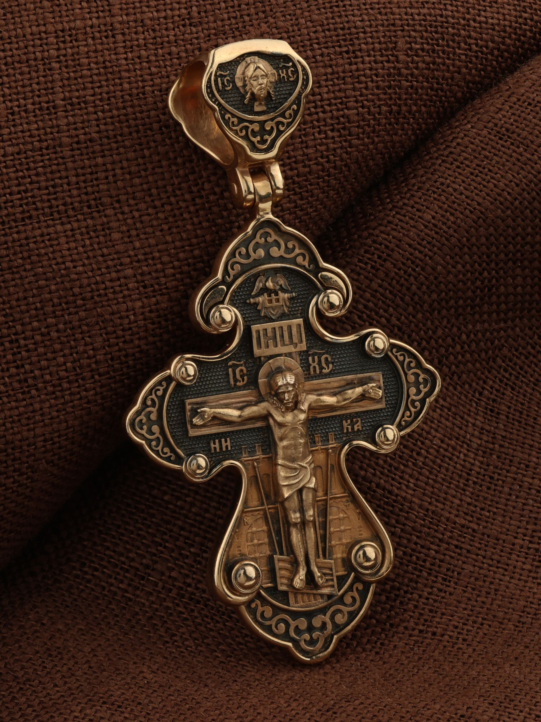 На лицевой стороне креста изображено Распятие Господа и Спасителя нашего Иисуса Христа, отдавшего Себя на смерть, для искупления грехов мира. Крест является символом жертвенной любви Всеблагого Бога к падшим людям, всепобеждающим духовным оружием христиан, основанием и средоточием церковной жизни. Господь сказал: кто хочет идти за Мною, отвергнись себя, и возьми крест свой, и следуй за Мною. (Мк. 8: 34). На верхней табличке, выше головы Иисуса, расположена надпись, составленная Понтием Пилатом — «IНЦI». Она означает «Иисус Назорей, Царь Иудейский». Надпись «IC» «ХC», означает Иисус Христос, помещается на разных сторонах поперечной перекладины креста. Рядом — слово «НИКА», что означает «победитель». За крестом высится Иерусалимская стена, в знак того, что Господь был распят вне стен города. На кулонном кольце изображен Нерукотворный образ Господа и Спасителя нашего Иисуса Христа, чудесно отпечатавшийся на плате, котором Христос вытер свой лик.