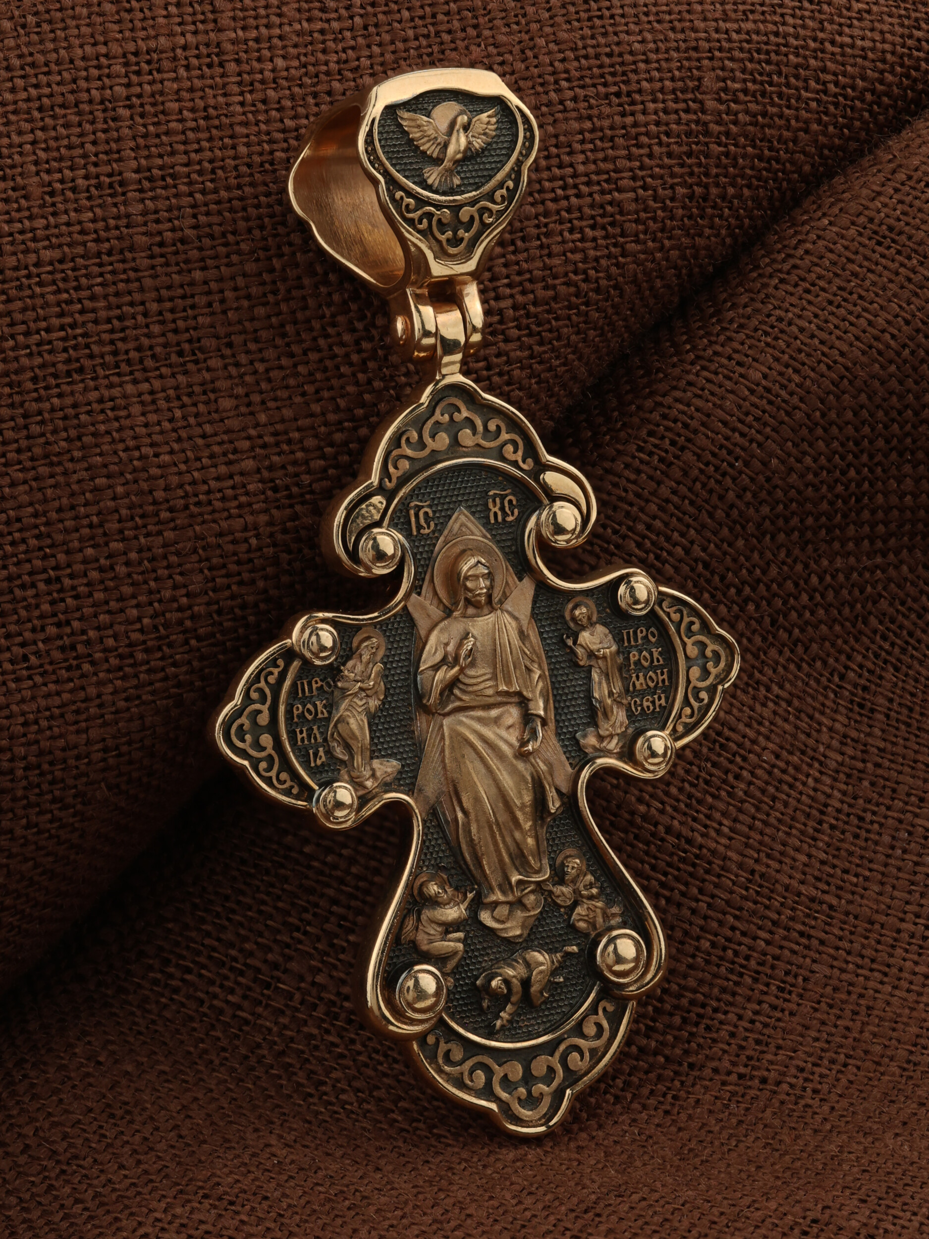 На оборотной стороне креста изображена икона «Преображение Господне». Иисус Христос вместе со своими учениками Петром, Яковом и Иоанном взошел на гору Фавор для молитвы. Пока Господь молился, ученики заснули, а проснувшись увидели, что Иисус преобразился — «лицо Его просияло, а одежды сделались ослепительно белыми». Рядом с Сыном Божьим они увидели ветхозаветных пророков — Моисея и Илию, которые беседовали с Ним о грядущих искупительных страданиях. Увидев такую картину, апостолов охватила неземная благодать, они захотели, чтобы это состояние продолжалось все время. А через некоторое время сверху сошло облако, которое скрыло Иисуса, Илию и Моисея от взора учеников и они услышали из облака Божий глас: « Сей есть Сын Мой возлюбленный, в Котором Мое благоволение. Его слушайте!» (Мф. 17,1−13). В страхе и почтении Петр, Иоанн и Иаков повалились на землю. Вскоре к ним подошел Иисус Христос в своей обычной одежде и сказал им, чтобы больше никто из людей, до Его Воскрешения, не знал о том, что произошло на этой горе. На кулонном кольце изображен парящий голубь — символ Святого Духа и Его благодати.
