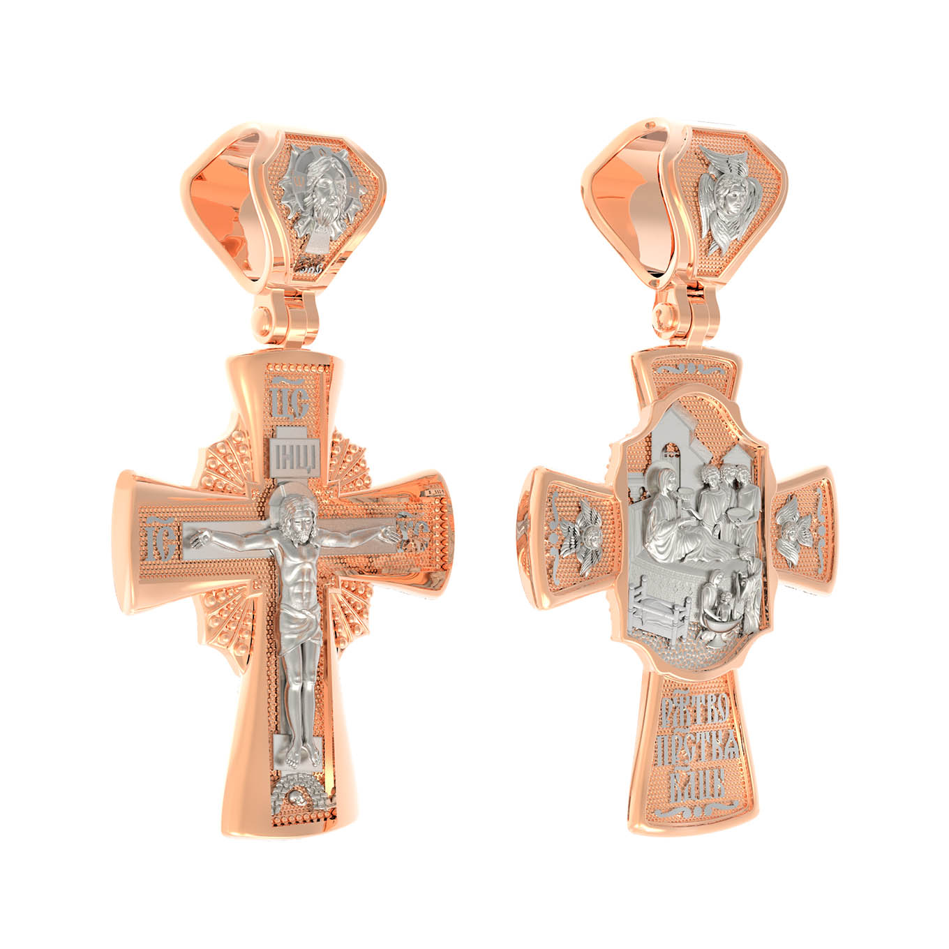 На лицевой стороне креста изображено Распятие Господа и Спасителя нашего Иисуса Христа, отдавшего Себя на смерть, для искупления грехов мира. Крест является символом жертвенной любви Всеблагого Бога к падшим людям, всепобеждающим духовным оружием христиан, основанием и средоточием церковной жизни. Господь сказал: кто хочет идти за Мною, отвергнись себя, и возьми крест свой, и следуй за Мною. (Мк. 8: 34). Над Распятием помещена надпись «Царь Славы». На верхней табличке, выше головы Иисуса, расположена надпись, составленная Понтием Пилатом — «IНЦI». Она означает «Иисус Назорей, Царь Иудейский». Надпись «IC» «ХC», означает Иисус Христос, помещается на разных сторонах поперечной перекладины креста. Возвышение, на котором стоит Крест, символизирует гору Голгофу, на которой произошло Распятие. Под подножием Креста изображена покоящаяся голова (череп) Адама. На кулонном кольце изображен Нерукотворный образ Господа и Спасителя нашего Иисуса Христа, чудесно отпечатавшийся на плате, которым Христос вытер свой лик. Ниже надпись — «IC» «ХC».