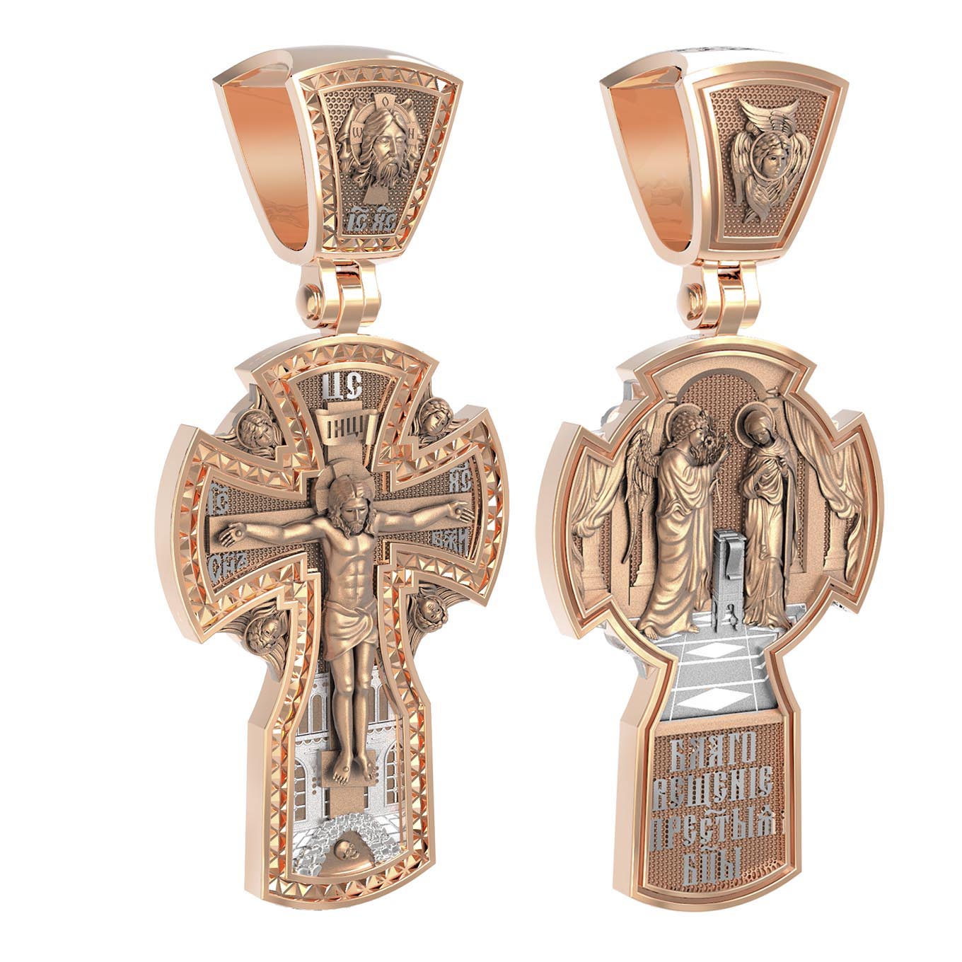 На оборотной стороне креста изображена икона «Благовещение Пресвятой Богородицы». Как нам повествует Священное Писание, Архангел Гавриил послан был от Бога в город Назарет к Пресвятой Деве Марии с радостной вестью, что Господь избрал Ее быть Матерью Спасителя мира. Ангел сказал: «Радуйся благодатная! Господь с Тобою! Благословенна Ты между женами». Мария cмутилась от слов Ангела и думала: что значит это приветствие? Ангел же продолжал говорить Ей: «не бойся, Мария, ибо Ты обрела благодать у Бога. И вот, Ты родишь Сына и наречешь имя Ему Иисус. Он будет велик, и назовется сыном Всевышнего, и Царству Его не будет конца…» На кулонном кольце изображен Ангел Серафим.