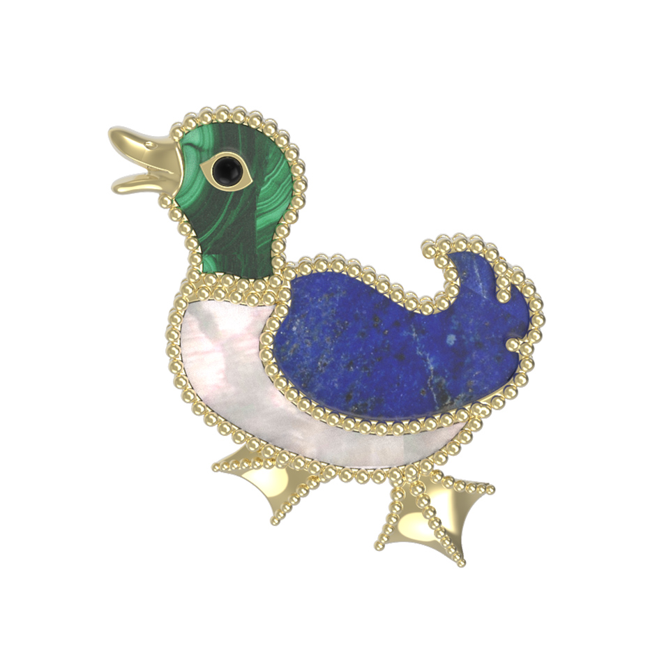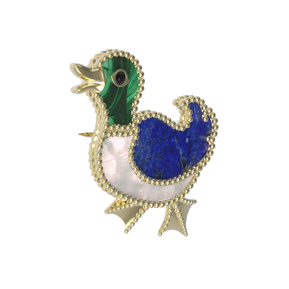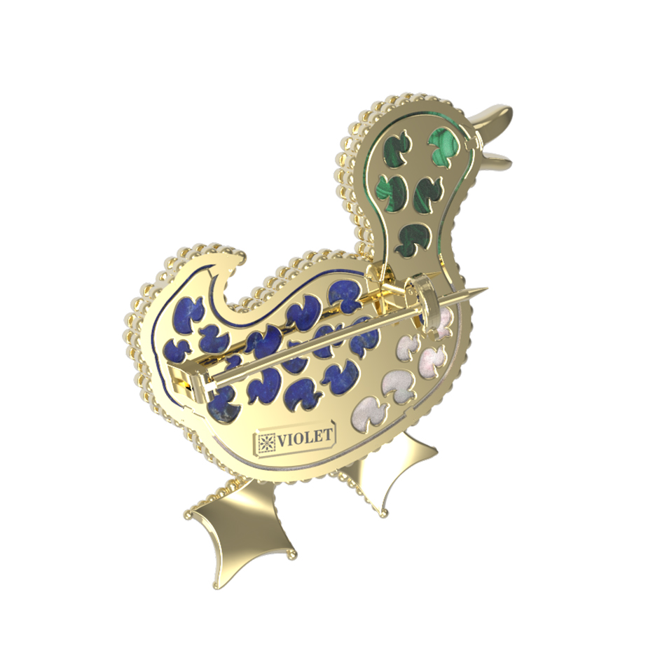 Брошь из лимонного золота c эмаль, лазуритом, малахитом и перламутром