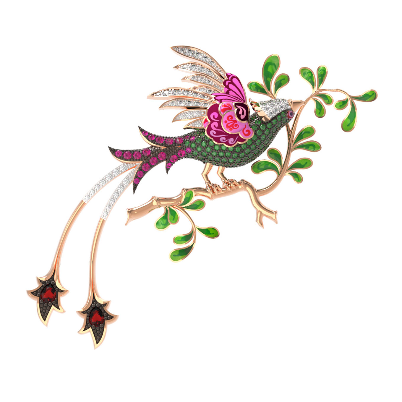 Брошь из золота c эмаль, фианитом и гранатом