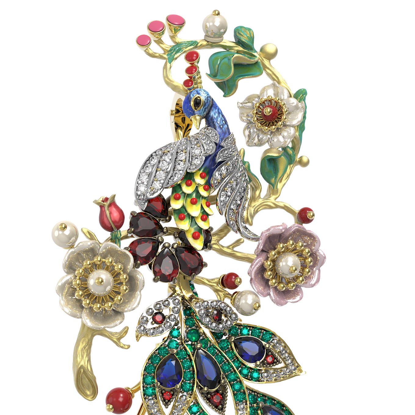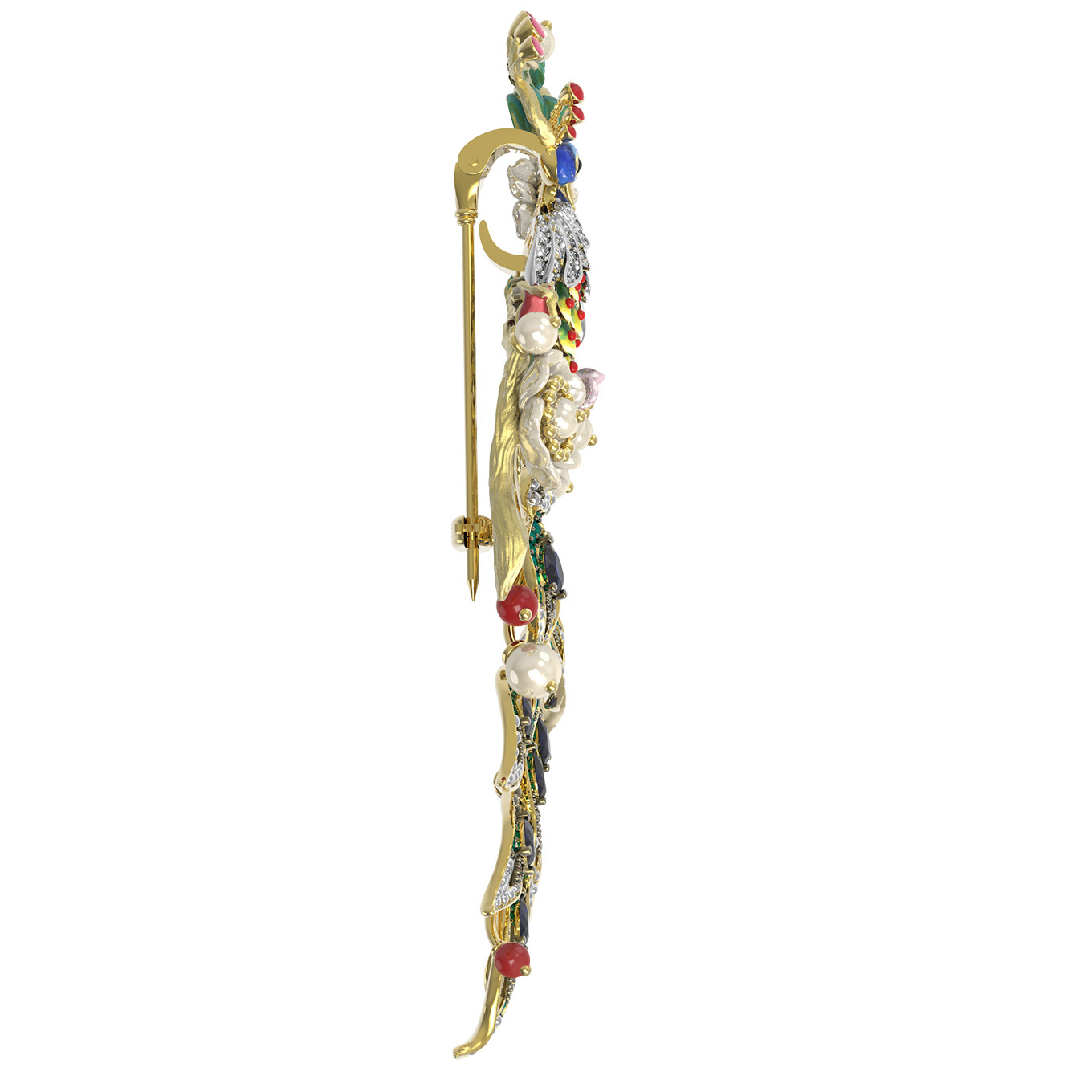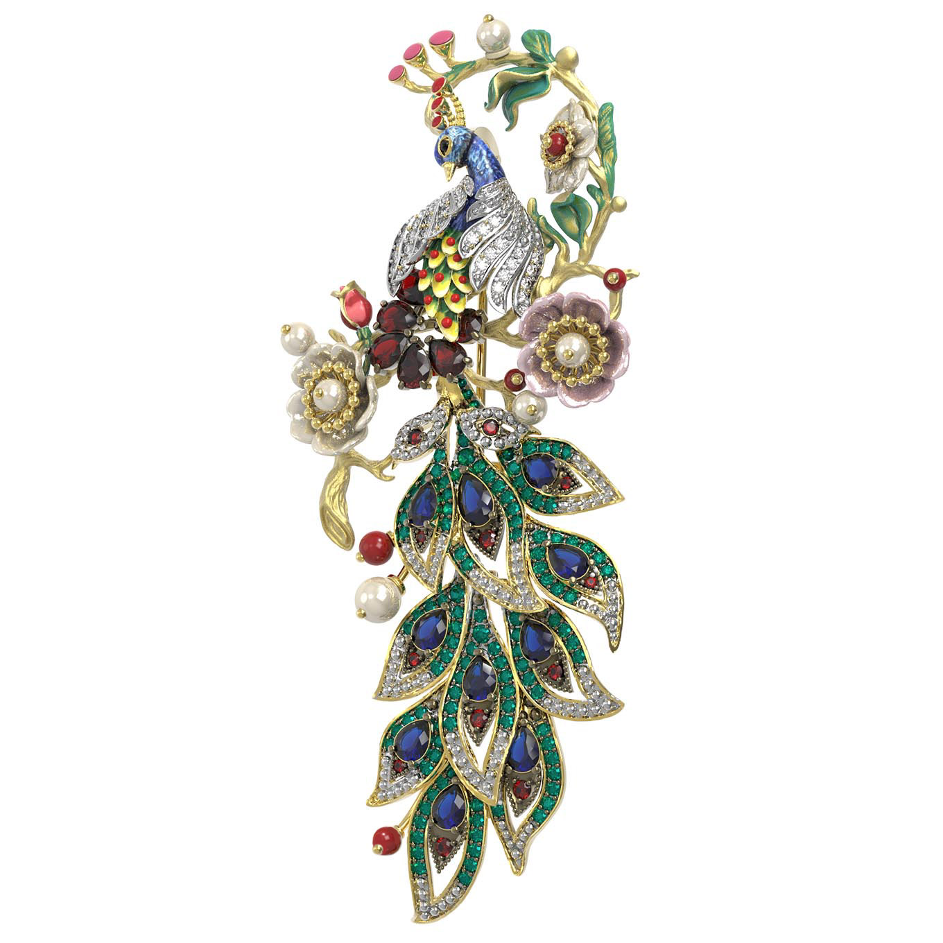 Брошь из лимонного золота c эмаль, фианитом, гранатом, жемчугом, сапфиром, кораллом и перламутром