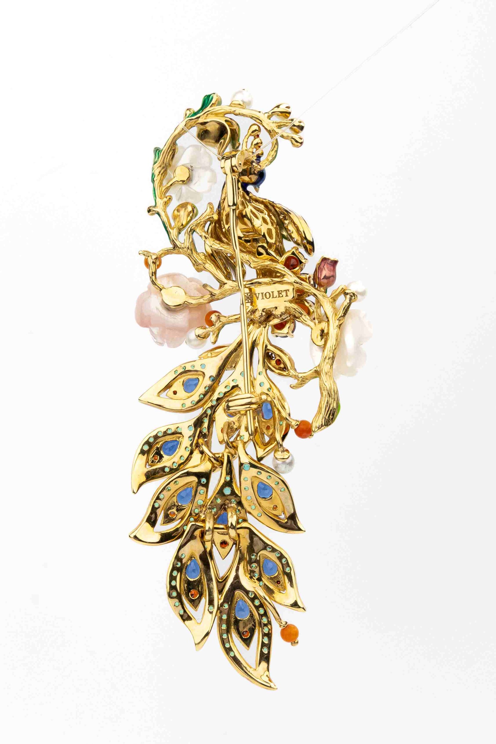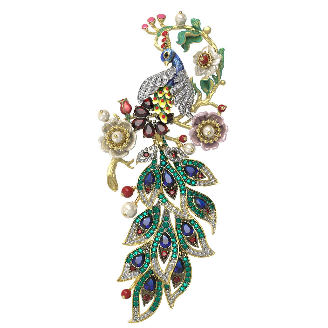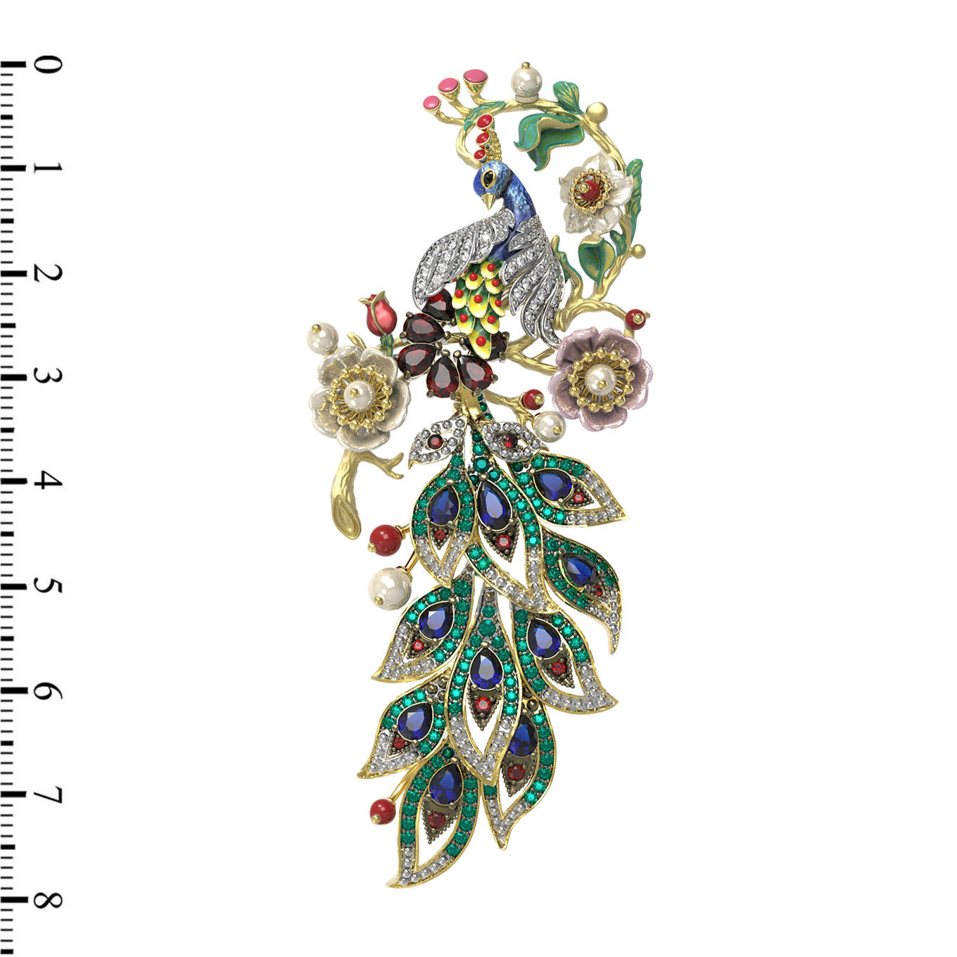 Брошь из лимонного золота c эмаль, фианитом, гранатом, жемчугом, сапфиром, кораллом и перламутром