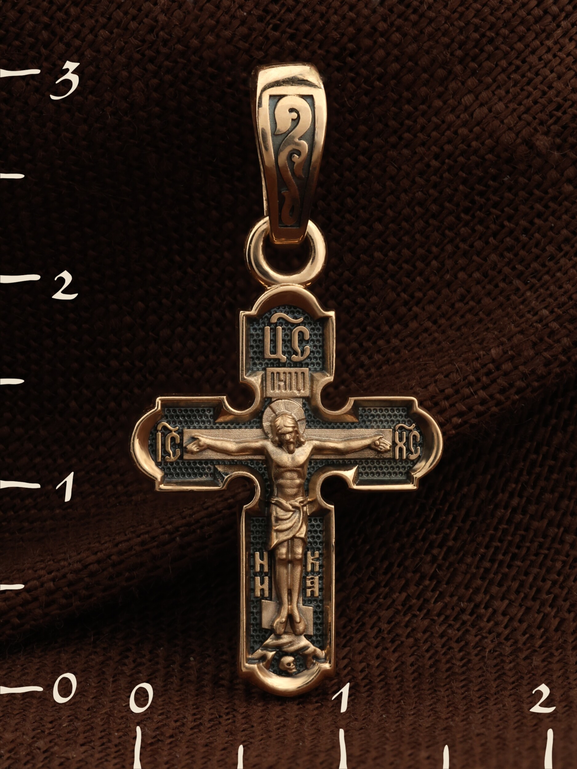 На лицевой стороне креста изображено Распятие Господа и Спасителя нашего Иисуса Христа, отдавшего Себя на смерть для искупления грехов мира. Крест является символом жертвенной любви Всеблагого Бога к падшим людям, всепобеждающим духовным оружием христиан, основанием и средоточием церковной жизни. Над вершиной Распятия помещена надпись «Царь Славы». На верхней перекладине расположена надпись «IНЦI». Она символизирует титло — табличку, на которой, согласно Евангелию, было начертано: Иисус Назорей, Царь Иудейский. Надпись «IC» «ХC»», означает Иисус Христос, помещаются на разных сторонах поперечной перекладины креста. Ниже помещена надпись «НИКА», что означает «победитель». Крест стоит на горе камней, символизирующих Голгофу. Под подножием Креста изображена покоящаяся голова (череп) Адама.