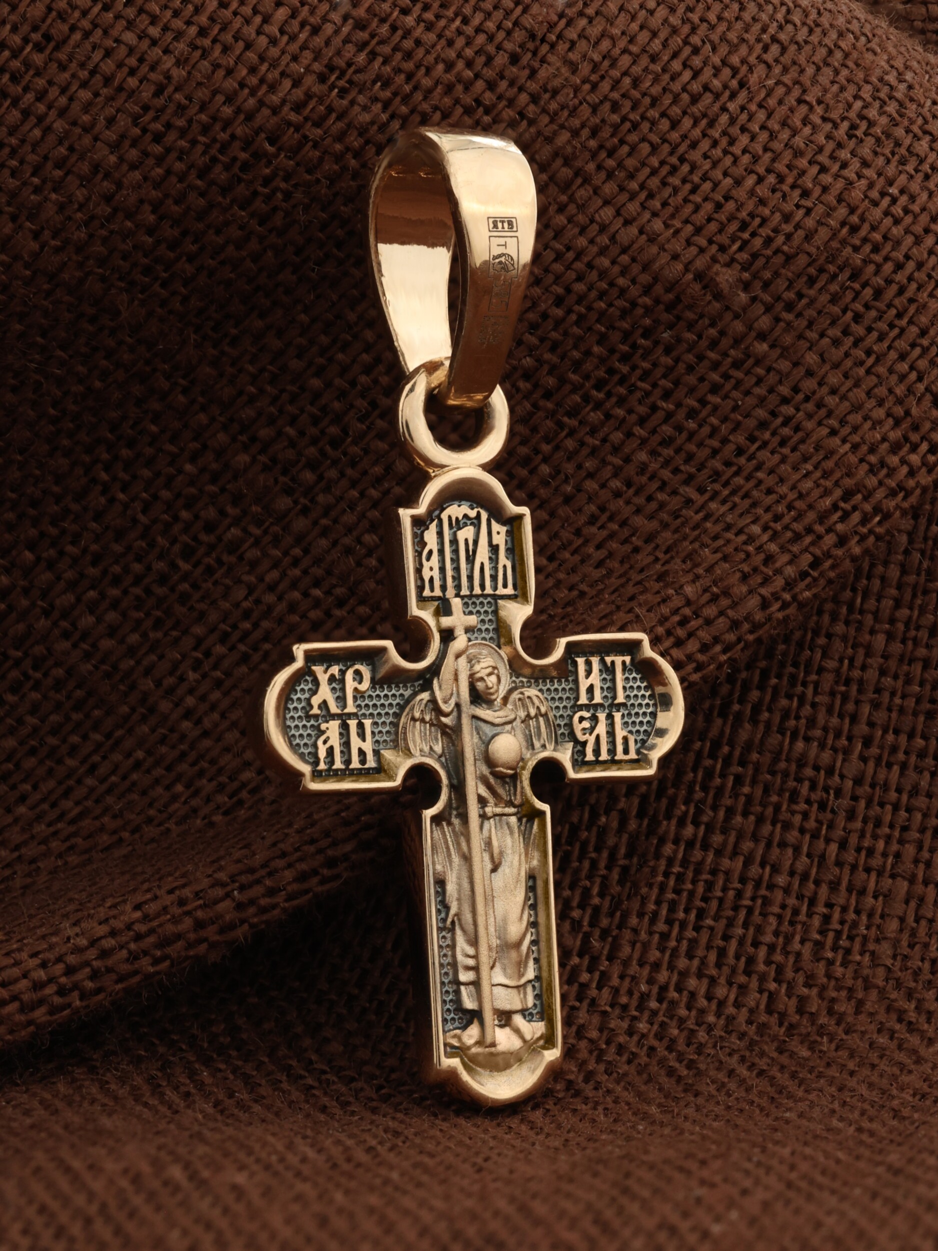 На оборотной стороне креста изображен святой Ангел-Хранитель в виде прекрасного юноши держащего в правой руке крест, а в левой — сферу. Ангел-Хранитель — это Ангел приставляемый Богом к человеку при крещении для охраны и помощи в добрых делах. Невидимо пребывая при нас постоянно, он, руководствуя нас ко спасению, не только по нашему желанию таинственно наставляет нас на все доброе и полезное, не только возносит наши молитвы к Богу, но еще и сам от себя охраняют и защищают нас от врагов видимых и невидимых, ходатайствует за нас пред Богом.