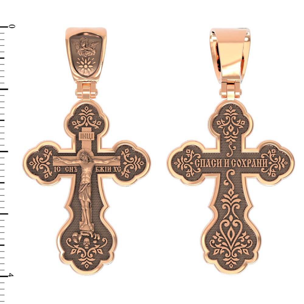 На лицевой стороне креста изображено Распятие Господа и Спасителя нашего Иисуса Христа. Христос, подвергнутый на кресте мучительной казни, своими страданиями искупил нас от древнего греха и даровал нам жизнь вечную. Крест означает своей вертикальной прямой линией справедливость и непреложность Божественных заповедей, прямоту Божией правды и истины, не допускающей никаких нарушений. Эта прямота пересекается главной поперечной перекладиной, означающей любовь и милость Божию к падшим и падающим грешникам, ради которой и был принесен в жертву Сам Господь, взявший на Себя грехи всех людей. На верхней табличке, выше головы Иисуса, расположена надпись, составленная Понтием Пилатом — «IНЦI». Она означает «Иисус Назорей, Царь Иудейский». Надпись «IС ХС» означает Иисус Христос и словосочетание «СЫН БОЖИЙ», что означает божественную природу Иисуса Христа, помещается на разных сторонах поперечной перекладины креста. Крест стоит на горе камней, символизирующих Голгофу. Под подножием Креста изображена покоящаяся голова (череп) Адама, грехи которого Христос омыл Своею Кровью. Христос в Своей Божественной любви, над которой смерть не властна и которая, страдая, и не страдает в обычном смысле, простирает к людям со Креста Свои объятия, в которые призывается и привлекается весь мир. Поэтому Тело Его не висит, а торжественно покоится на Кресте. Здесь Христос, распятый и умерший, удивительным образом жив в самой смерти Своей. На кулонном кольце изображен Ангел Херувим. Херувимы сияют всегда светом Богопознания, ведением таин и глубин премудрости Божией, сами просвещаемые и других просвещающие.