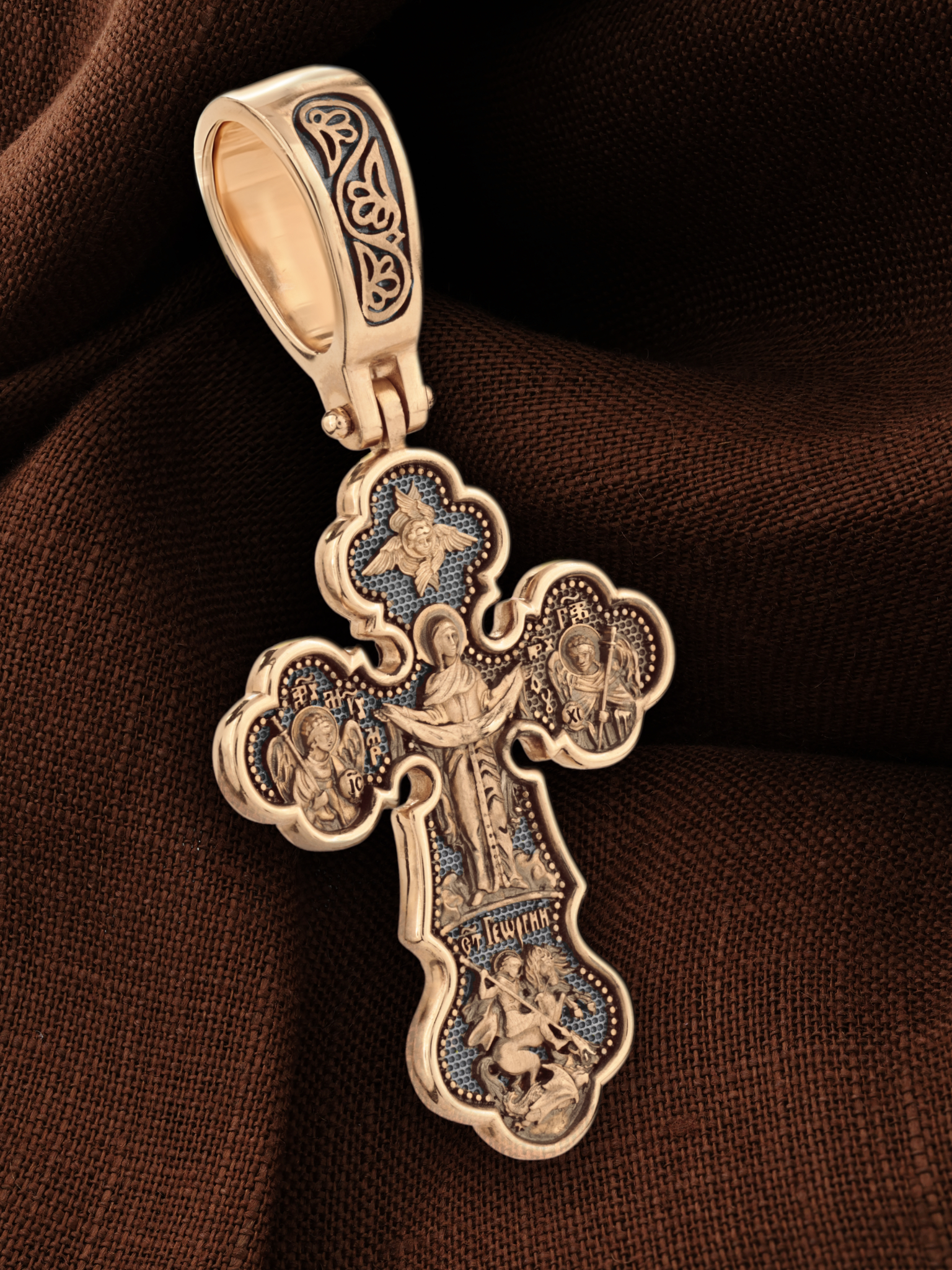 Центральную часть оборотной стороны креста украшает икона Божией Матери «Покров Пресвятой Богородицы». Праздник Покрова Пресвятой Богородицы пришел на Русь в XII веке из Византии и стал одним из самых почитаемых. Пресвятая Богородица простирает Свой молитвенный покров над всеми православными христианами и умоляет Сына своего о даровании вечного спасения каждому человеку. Над образом помещен шестикрылый Серафим. Справа помещено изображение Архангела Гавриила, слева- Архангела Михаила. На кресте внизу помещено изображение Святого Великомученика Георгия Победоносца — одного из самых почитаемых и удивительных святых. Он изображен как воитель, сидящий на вздыбленном коне и поражающий копьем огнедышащего змея. Змей символизирует собою сатанинские силы.