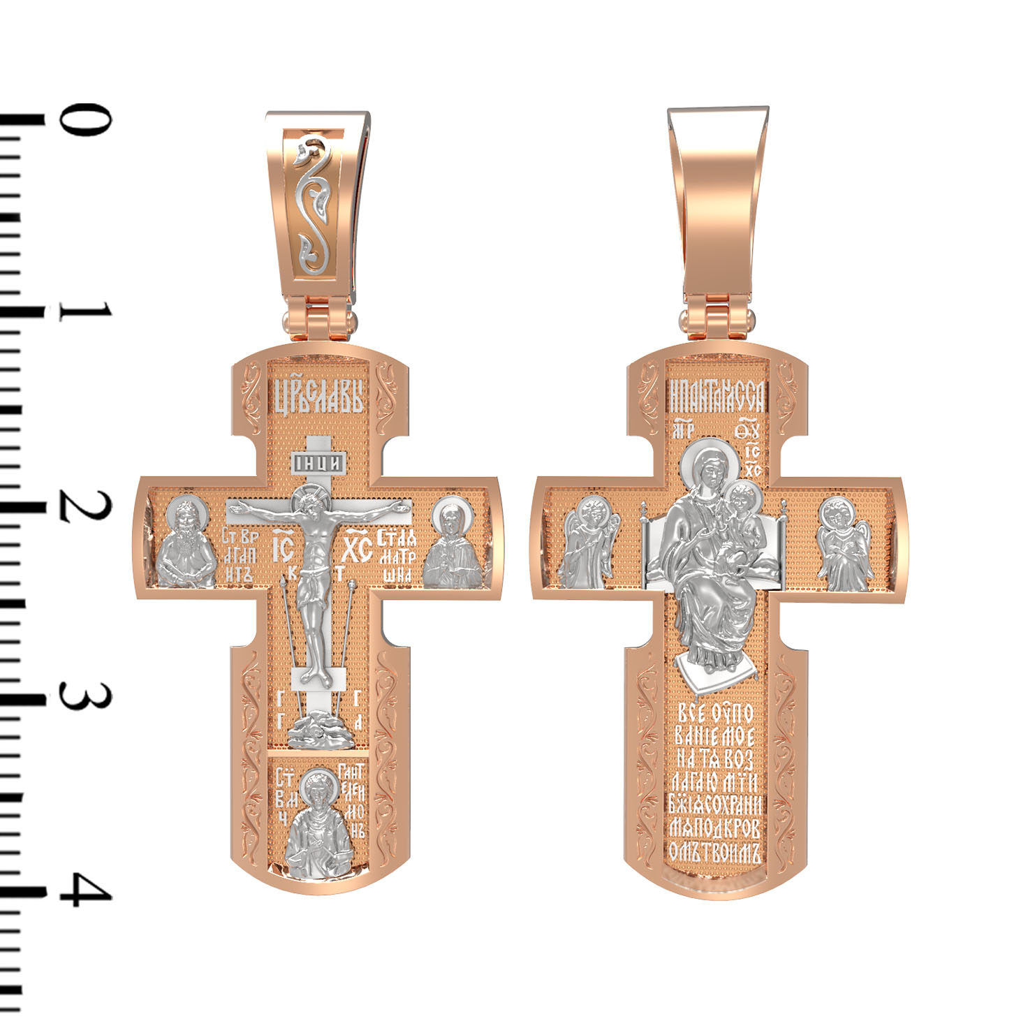 Как действенная помощь в немощах и болезнях был создан крест с образами святых целителей и со знаменитой афонской иконой Божией Матери «Всецарица». На лицевой стороне креста изображено Распятие Иисуса Христа. Над титлом видим слова «ЦРЬ СЛВЫ» — Царь Славы. Верхняя перекладина символизирует собой табличку с надписью «IHЦI» — Иисус Назарянин Царь Иудейский. Под перекладиной пишется сокращенно имя Спасителя «IC XC» — Иисус Христос. Возвышение, на котором стоит Крест, символизирует гору Голгофу, на которой произошло Распятие. У подножия Креста изображают прах Адама, обозначенный черепом. Справа от Распятия помещен образ прославленной святой блаженной Матроны. Слева — икона Преподобный Агапита. Этот святой жил в пещерах Киево-Печерского монастыря в XI веке и бескорыстно врачевал мирян и монахов. У основания Креста Господня изображен великомученик Пантелеимон Целитель. Господь даровал удивительную силу его молитве. Ею он исцелял любые болезни и даже воскрешал умерших.
