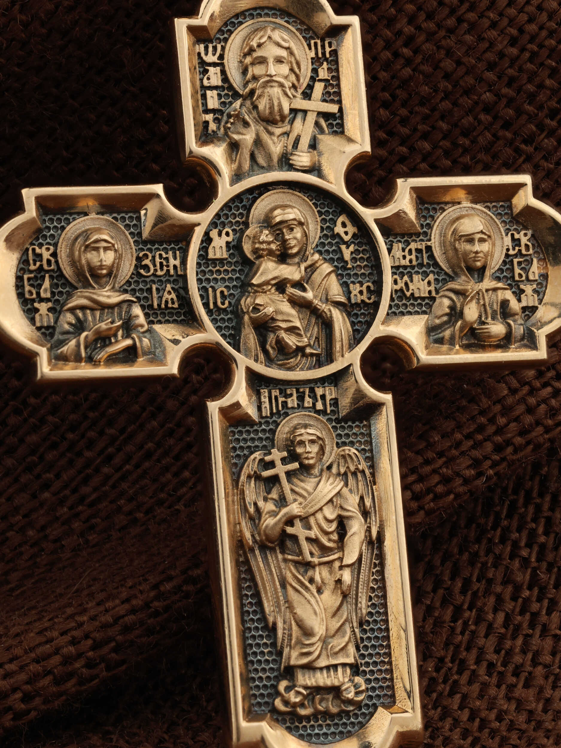 Центральную часть оборота креста украшает Владимирская икона Божией Матери. По преданию, она была написана на доске трапезного стола из дома Иисуса Христа. На Русь икона была привезена в начале XII века и с тех пор почитается как главная святыня нашего Отечества. Внизу изображен Архангел Михаил, слева — Святая Блаженная Ксения, справа — Святая Блаженная Матрона, вверху — пророк, почитающийся в христианстве, Предтеча Господень Иоанн Креститель. На кулонном кольце изображен Спас Нерукотворный — Символ вочеловечившегося Божества.