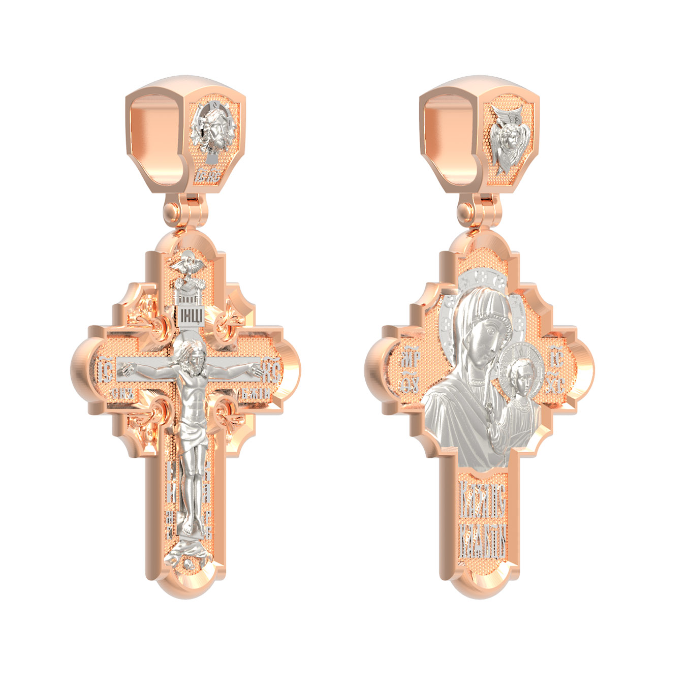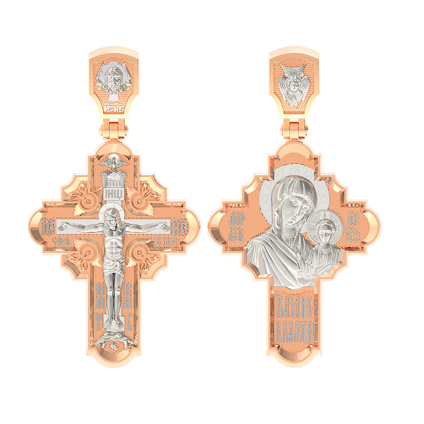 На оборотной стороне креста изображена Казанская икона Божией Матери. Пресвятая Богородица — милосердная заступница, просительница за нас перед Богом. Она стала воистину нашей Матушкой, охраняющей и поддерживающей нас от рождения до самой смерти, а Ее благодатная помощь изливается на нас по молитвам у ее чудотворных икон. Казанская икона явилась в 1579 году в Казани, вскоре после взятия Казанского царства у татар Иоанном Грозным. Этот образ Богородицы не раз сопровождал русский народ в бедствиях. Икона Божией Матери Казанская вдохновляла русских ратников в период Смутного времени при освобождении Москвы от поляков. Перед Казанской иконой в 1709 году, накануне Полтавской победы, император Петр I молился о даровании победы русскому войску. В 1812 году накануне отъезда в действующую армию перед чудотворной иконой Божией Матери молился князь Михаил Кутузов. Не только государственным мужам и дружинам указывала путь икона — по доброй традиции именно этой иконой благословляют на брак молодых родители, длинным списком чудес сопровождается этот образ Богоматери — один из самых любимых на Руси. Существует множество древних списков с этой удивительной иконы.