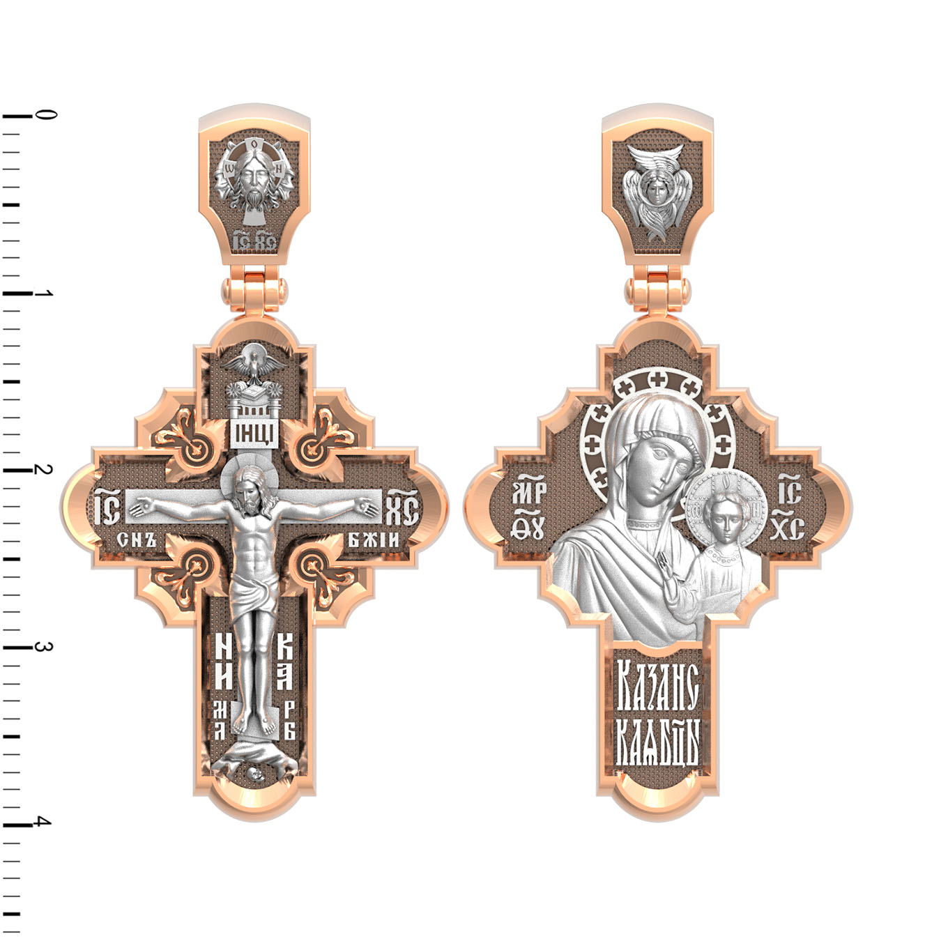 На оборотной стороне креста изображена Казанская икона Божией Матери. Пресвятая Богородица — милосердная заступница, просительница за нас перед Богом. Она стала воистину нашей Матушкой, охраняющей и поддерживающей нас от рождения до самой смерти, а Ее благодатная помощь изливается на нас по молитвам у ее чудотворных икон. Казанская икона явилась в 1579 году в Казани, вскоре после взятия Казанского царства у татар Иоанном Грозным. Этот образ Богородицы не раз сопровождал русский народ в бедствиях. Икона Божией Матери Казанская вдохновляла русских ратников в период Смутного времени при освобождении Москвы от поляков. Перед Казанской иконой в 1709 году, накануне Полтавской победы, император Петр I молился о даровании победы русскому войску. В 1812 году накануне отъезда в действующую армию перед чудотворной иконой Божией Матери молился князь Михаил Кутузов. Не только государственным мужам и дружинам указывала путь икона — по доброй традиции именно этой иконой благословляют на брак молодых родители, длинным списком чудес сопровождается этот образ Богоматери — один из самых любимых на Руси. Существует множество древних списков с этой удивительной иконы.