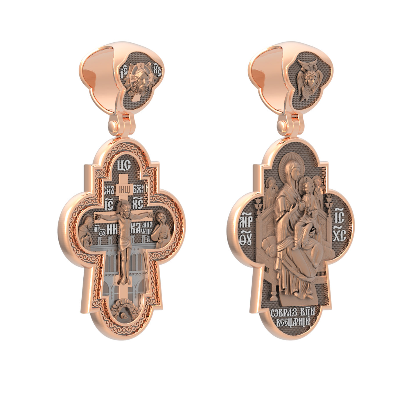 На оборотной стороне креста изображена икона Божией Матери «Всецарица» или «Пантанасса», на которой Пресвятая Богородица восседает на царском троне. На руках Ее — Богомладенец Христос со свитком в левой руке и благословляющий десницей. Правой рукой Богородица указывает на Своего Царственного Сына, как на Спасителя мира. Чудотворная икона была написана в XVII веке и находится на Святой Горе Афон, в одном из древних греческих монастырей — Ватопеде. По молитвам перед иконой совершается множество чудесных исцелений. Пречистая Богородица наставляет на праведный путь, помогает укрепить веру, найти утешение. На кулонном кольце изображен шестикрылый Серафим.