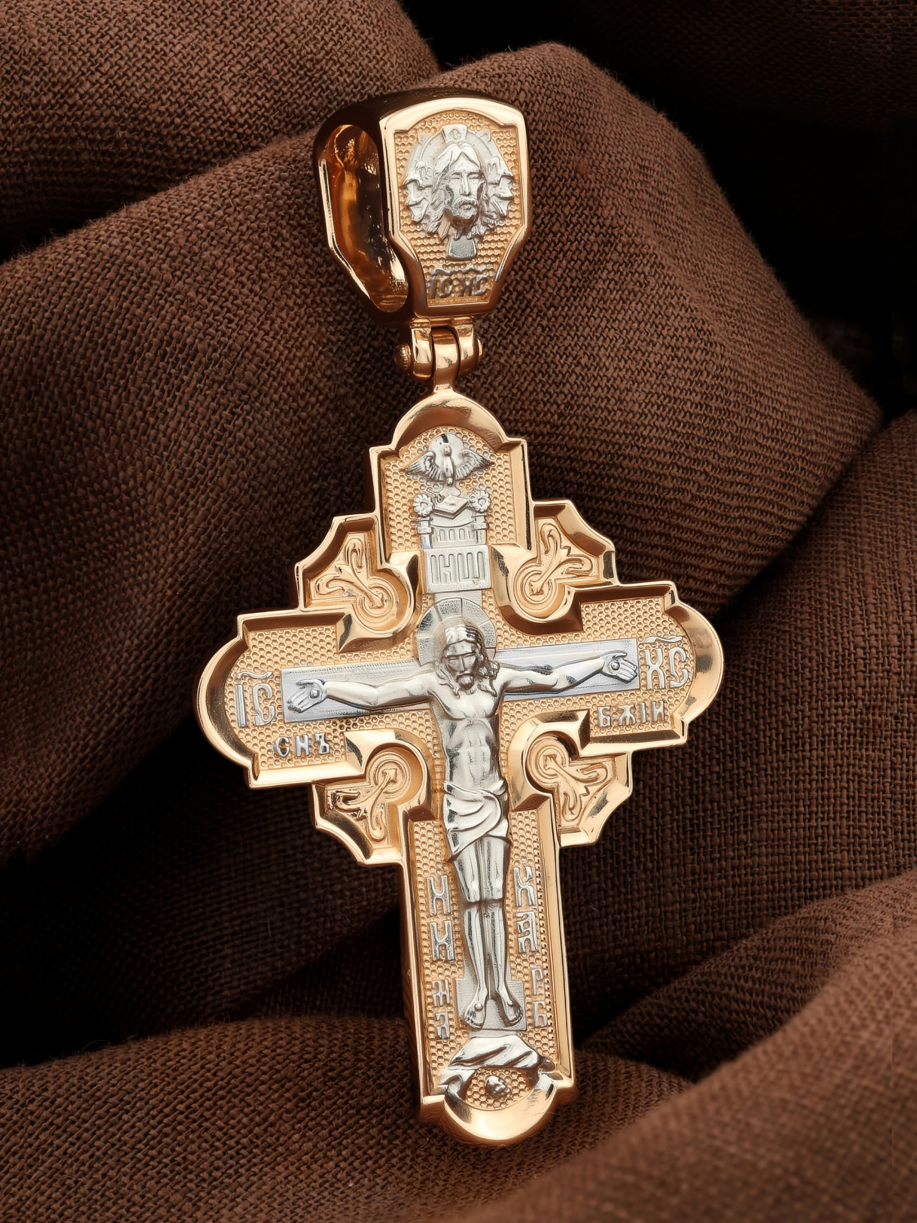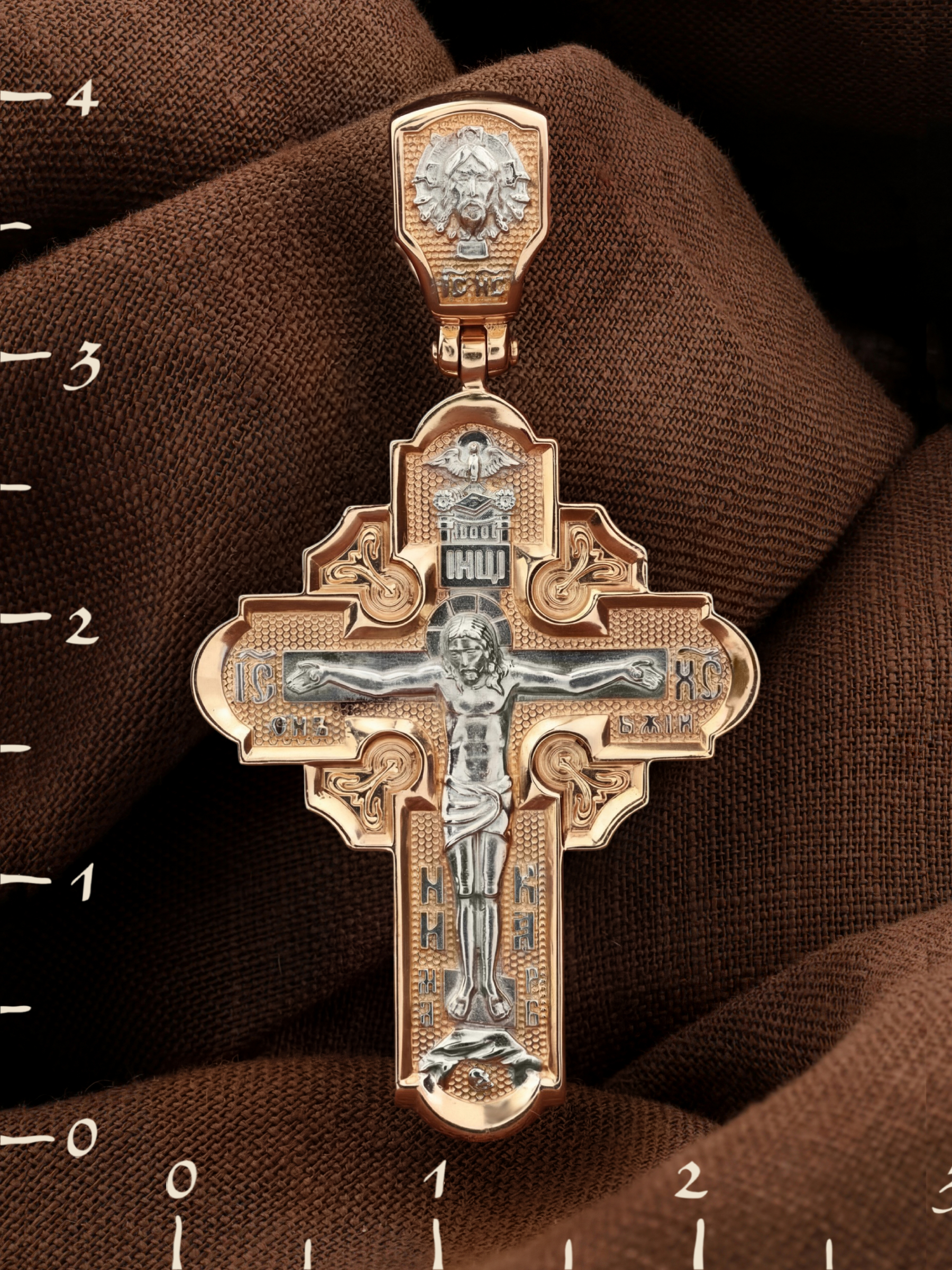 На лицевой стороне креста изображено Распятие Господа и Спасителя нашего Иисуса Христа, отдавшего Себя на смерть, чтобы другие могли жить — жить вечной жизнью, жить с Богом. Своею кровью Господь освятил крест и сделал его проводником Своей благодати, источником освящения верующих. На верхней табличке, выше головы Иисуса, расположена надпись, составленная Понтием Пилатом — «ИНЦИ». Она означает «Иисус Назорей, Царь Иудейский». Надпись «IС ХС» означает Иисус Христос помещается на разных сторонах поперечной (большой) перекладины креста. На кулонном кольце помещено изображение Духа Святого в виде голубя, сходящего с Небес