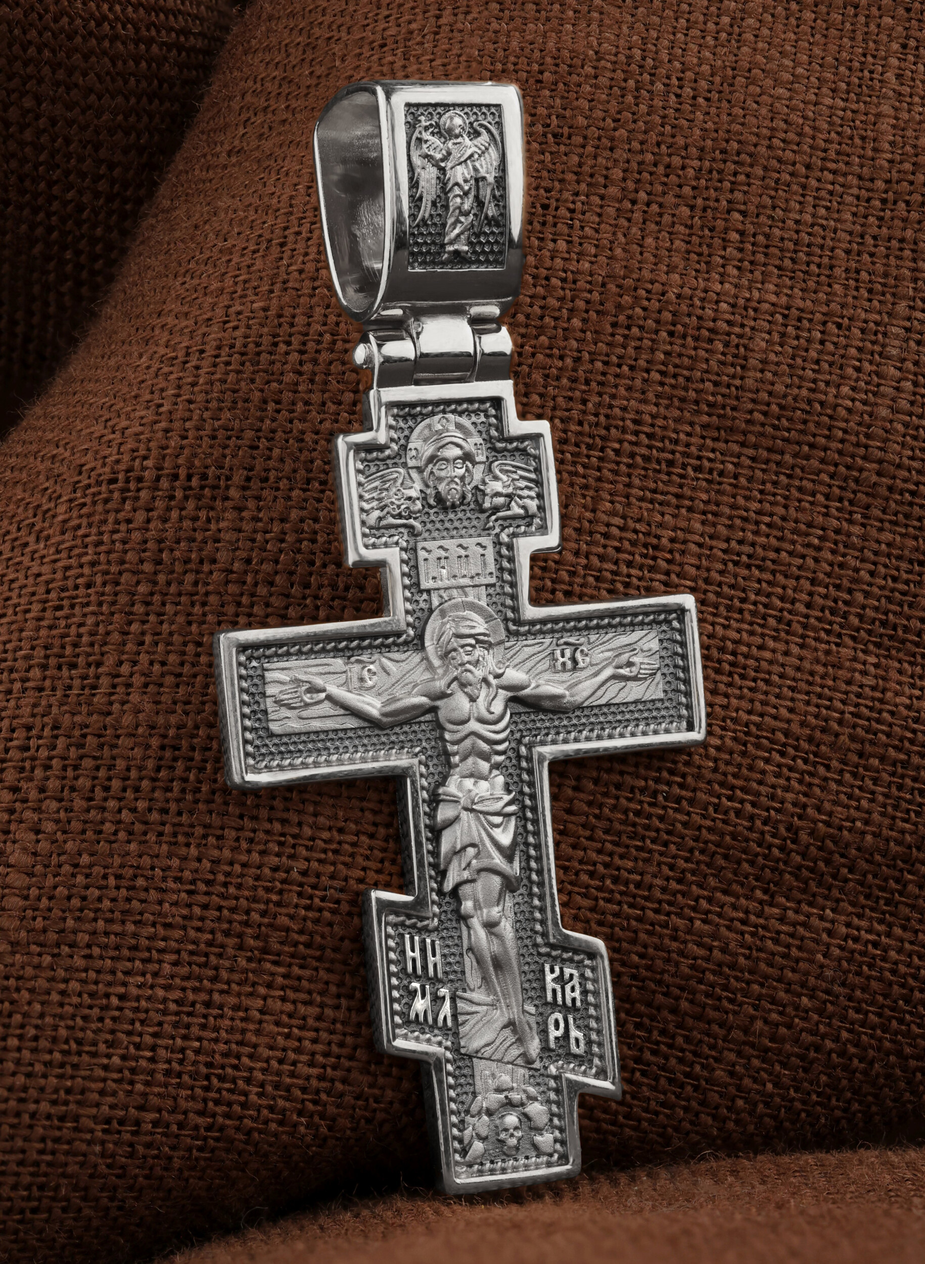 На лицевой стороне креста изображено Распятие, потому что это орудие казни Иисус Христос сделал орудием победы над грехом и смертью. Своими страданиями Он искупил грехи человечества, умерев и сошествовав во ад, победил сатану, освободил души праведников от вечной смерти и открыл им небесные врата рая. Жертва Христа сделала возможным спасение для каждого человека. На православном кресте Христос не умирает, а свободно простирает руки, ладони Иисуса открыты, будто он хочет обнять все человечество, даря им свою любовь и открывая путь к вечной жизни. Верхняя перекладина символизирует собой табличку с надписью «IHЦI» — Иисус Назарянин Царь Иудейский. У подножия добавляется: «НИКА» (греч. — Победитель) и «МЛРБ» — Место Лобное Рай Бысть. Возвышение, на котором стоит Крест, символизирует гору Голгофу, на которой произошло Распятие. У подножия Креста изображают прах Адама, обозначенный черепом.