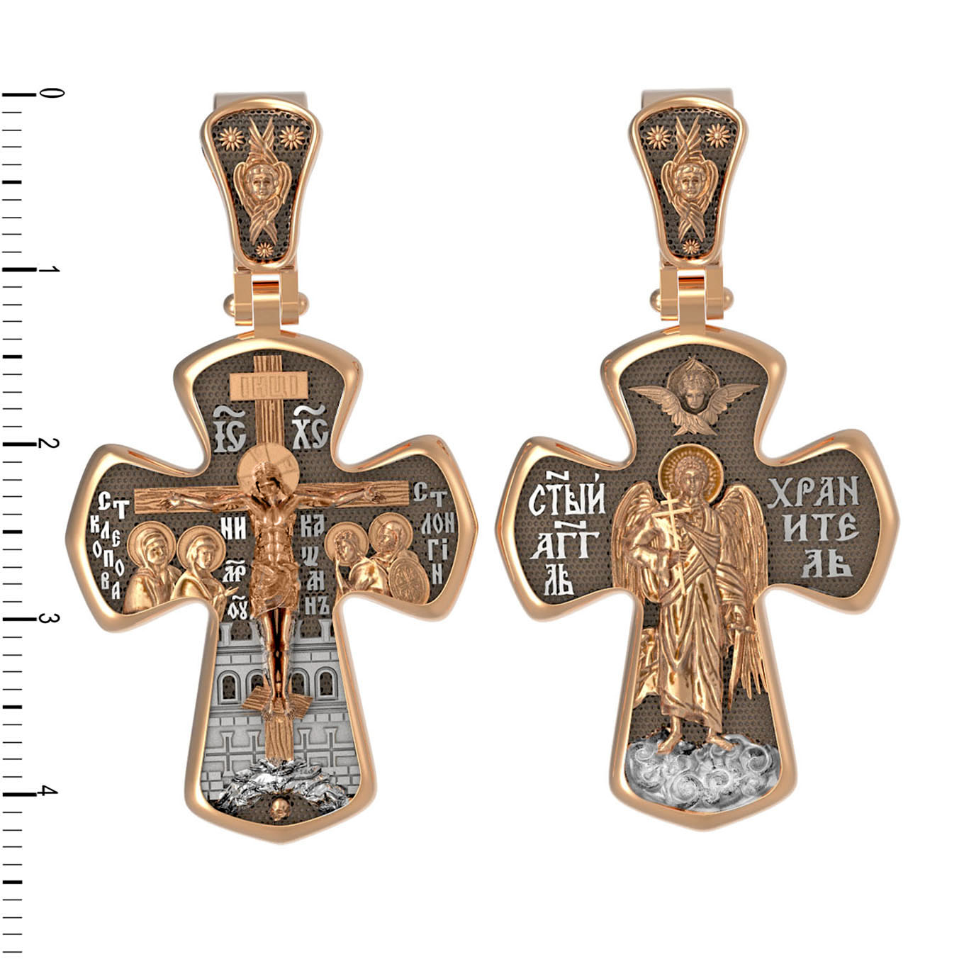 На оборотной стороне креста изображен Святой Ангел-Хранитель держащего в правой руке крест, а в левой — мечь. Ангел-Хранитель — это Ангел приставляемый Богом к человеку при крещении для охраны и помощи в добрых делах. Он невидимо находится при человеке на протяжении всей его жизни, если человек сохраняет в себе любовь к Богу и истинную веру перед Ним. Ангел-Xранитель делают для нас все, что служит к истинному нашему благу и спасению. Невидимо пребывая при нас постоянно, он, руководствуя нас ко спасению, не только по нашему желанию таинственно наставляет нас на все доброе и полезное, не только возносит наши молитвы к Богу, но еще и сам от себя охраняют и защищают нас от врагов видимых и невидимых и ходатайствует за нас пред Богом. Одного лишь каждому из нас он желает — спасения души; к этому он направляет все свои заботы. Над образом помещен Серафим.