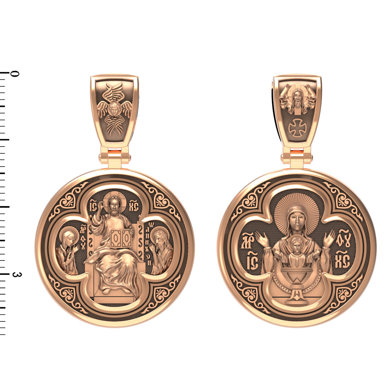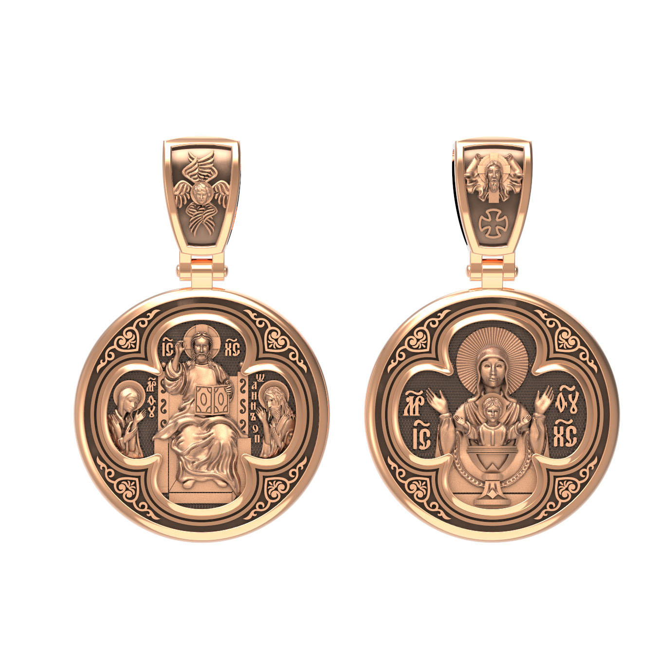 На лицевой стороне образка изображена икона Иисуса Христа Деисус. Он представлен в образе Господа Вседержителя, восседающего на престоле. В его руках — Книга Судеб всего человечества. С двух сторон ему предстоят Пресвятая Богородица и пророк Иоанн Предтеча, Креститель Господень.
