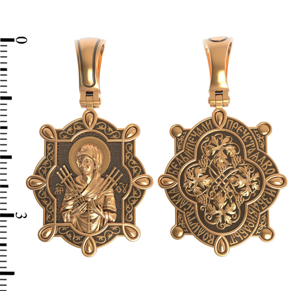 На лицевой стороне образка изображена икона Пресвятой Богородицы «Семистрельная» — одна из самых чудотворных икон на Руси. На протяжении многих веков христиане взывали к Царице Небесной через эту икону, если в стране начинались войны или мятежи.