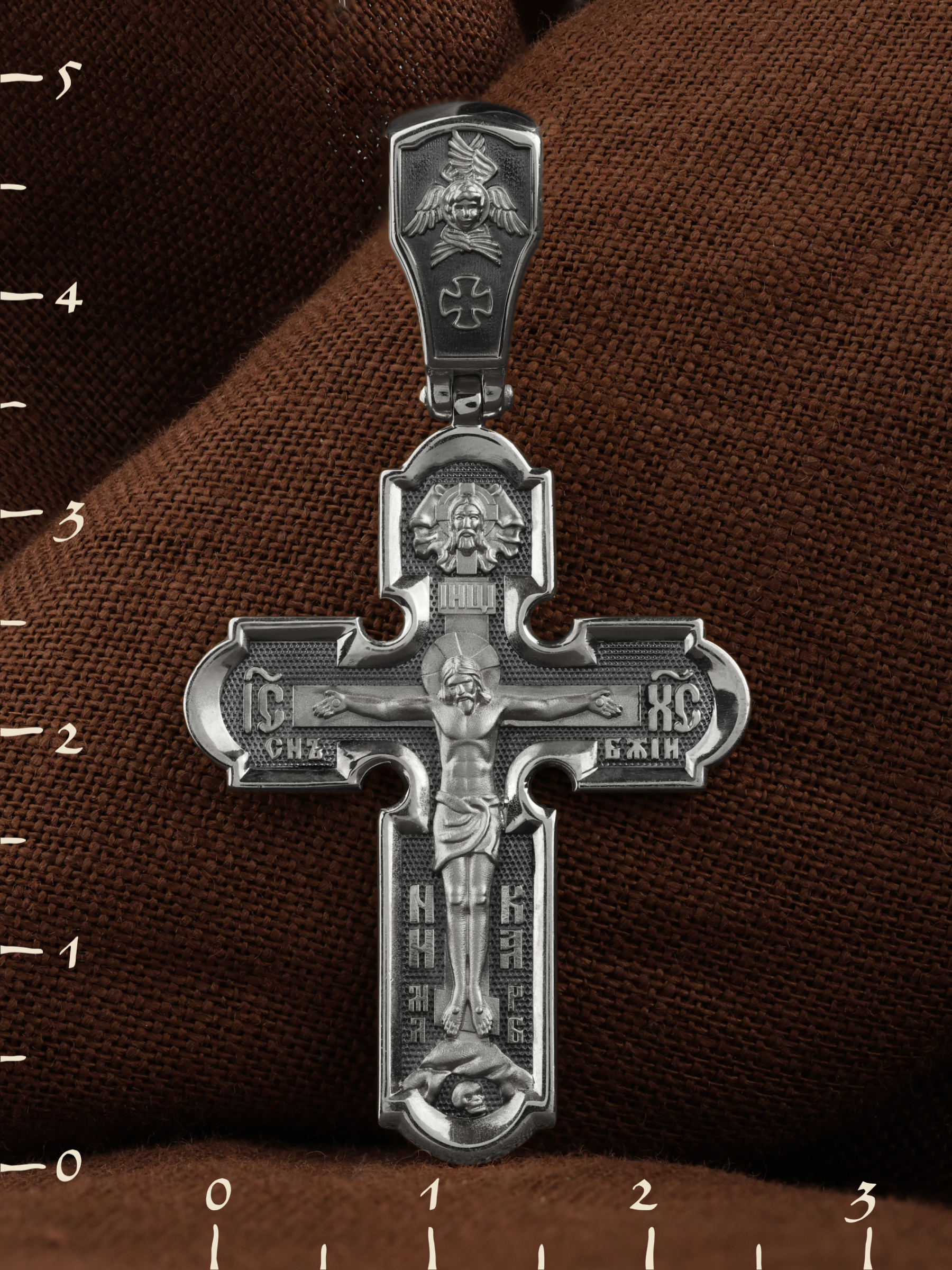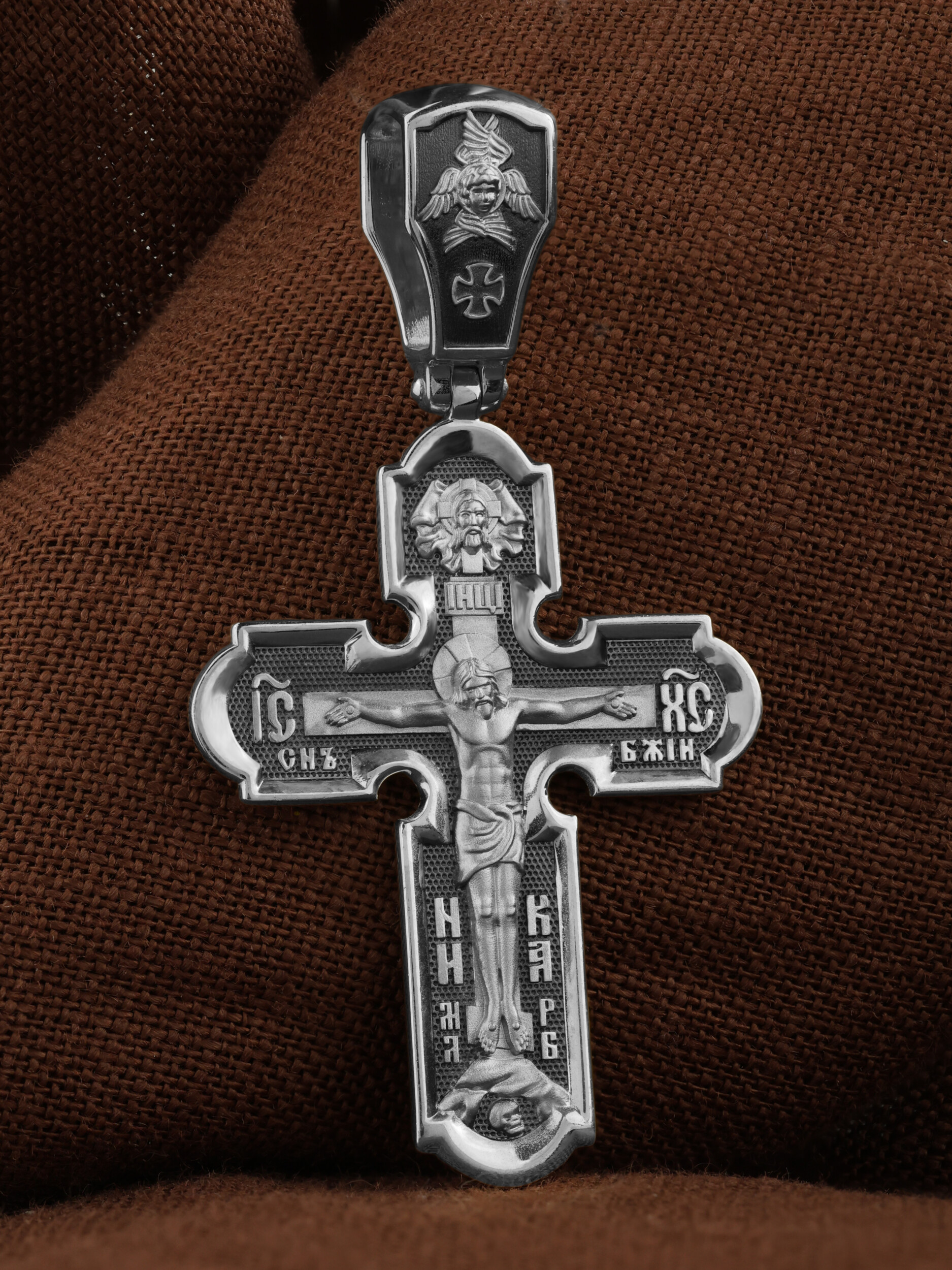 На лицевой стороне нательного креста по традиции изображено Распятие Господа нашего Иисуса Христа. Крест Господень стоит на небольшом каменистом возвышении, символизирующем гору Голгофу, которая обозначена буквами МЛРБ (Место Лобное Рай Бысть). Над головой Господа на поперечной перекладине написано «ИНЦИ», что символизирует табличку, которая была прибита к Кресту, с надписью «Иисус Назорей Царь Иудейский». Этим иудеи хотели посмеяться над Христом, не зная, что распинают истинного Царя всех царей. По сторонам основной перекладины расположены позолоченные рельефные инициалы Христа «ИС ХС». Под перекладиной, по сторонам древа, находится надпись «СЫН БОЖИЙ», а в основании креста — надпись «НИКА» (Победитель).