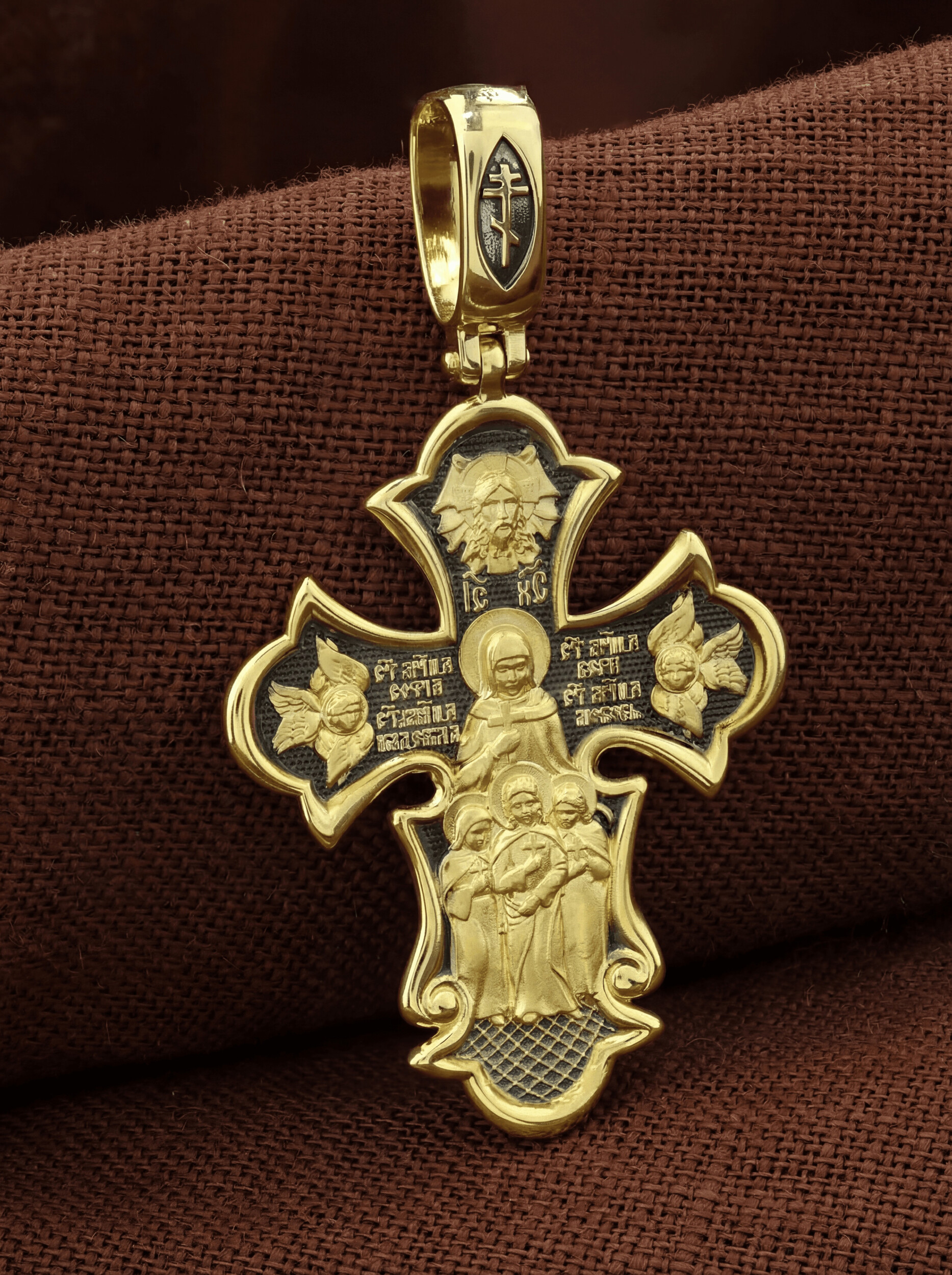 На оборотной стороне креста изображены Святые мученицы Вера, Надежда, Любовь и матерь их София, жившие во 2 веке нашей эры в Римской империи. Известно, что София была родом из Милана. Она рано овдовела, после чего перебралась в Рим. Своих дочерей София воспитывала в христианской вере и даже дала им имена в честь главных христианских добродетелей — Вера, Надежда и Любовь. В те годы римское государство жестоко преследовало верующих во Христа. Маленьких девочек (старшей Вере тогда было всего 12, а младшей Любови лишь 9) арестовали, подвергли истязаниям, а затем умертвили на глазах их матери. Сама София скончалась на следующий день у могилы своих дочерей. Но трагическая судьба на земле обернулась для мучениц вечной славой в ином мире. Церковь причислила их к лику святых и сегодня по молитвам к ним происходят чудеса. Выше образов мучениц изображен Спас Нерукотворный — образ Господа и Спасителя нашего Иисуса Христа, чудесно отпечатавшийся на плате, котором Христос вытер свой лик. По обеим сторонам креста изображены Ангелы Серафимы. На кулонном кольце помещен крест.
