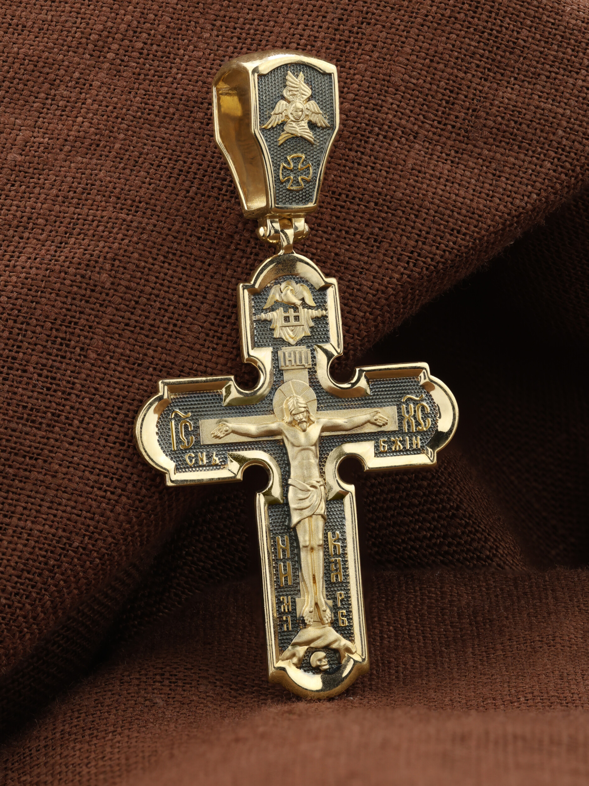 На лицевой стороне креста изображено Распятие Господа и Спасителя нашего Иисуса Христа. Христос, подвергнутый на кресте мучительной казни, своими страданиями искупил нас от древнего греха и даровал нам жизнь вечную. Без Распятия не было бы Воскресения Христова, и поэтому Крест из орудия казни обратился в святыню, в которой действует Благодать Божия. Над Распятием изображен Дух Святой в виде голубя, сходящего с Небес. Распятие сопровождается каноническими надписями. На верхней табличке, выше головы Иисуса, расположена надпись, составленная Понтием Пилатом на трех языках — «IНЦI». Она означает «Иисус Назорей, Царь Иудейский». Надпись «IС ХС» означает Иисус Христос и помещается на разных сторонах поперечной (большой) перекладины креста. Ниже — словосочетание «СЫН БОЖИЙ», что означает божественную природу Иисуса Христа. Крест стоит на горе камней, символизирующих Голгофу. В ее основании различается череп — это голова Адама. Надписи «Ника», что означает Победитель, и надпись «МЛРБ» — «место лобное рай бысть», что означает место лобное стало раем, размещены в нижней части креста. На кулонном кольце изображен шестикрылый Серафим.