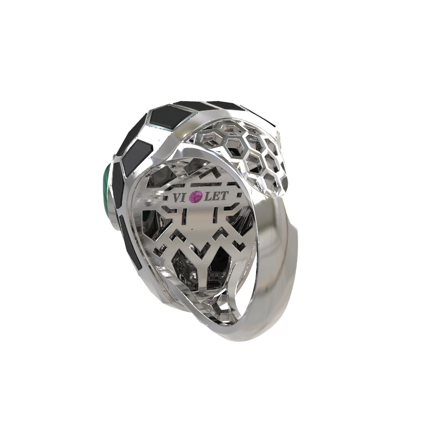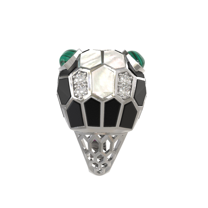 Кольцо из белого золота c бриллиантами, рубином, ониксом, малахитом и перламутром