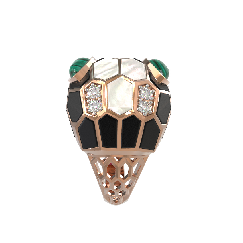 Кольцо из золота c бриллиантами, рубином, ониксом, малахитом и перламутром