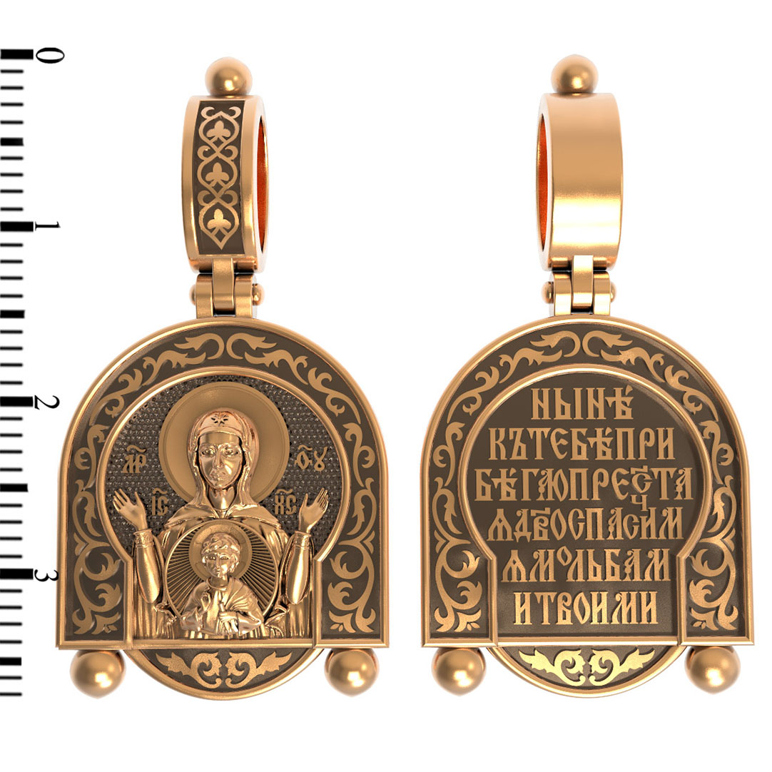 В центр образка помещен образ Божией Матери «Знамение», прославившийся многими чудесами в Новгороде в XII веке. Икона эта чтится как одна из самых великих святынь Русской земли. Молитвенно воздетые руки Богородицы означают заступничество за людей пред Богом. Рядом с Ней, на фоне круглого щита, — благословляющий Божественный Младенец — Спас-Эммануил.