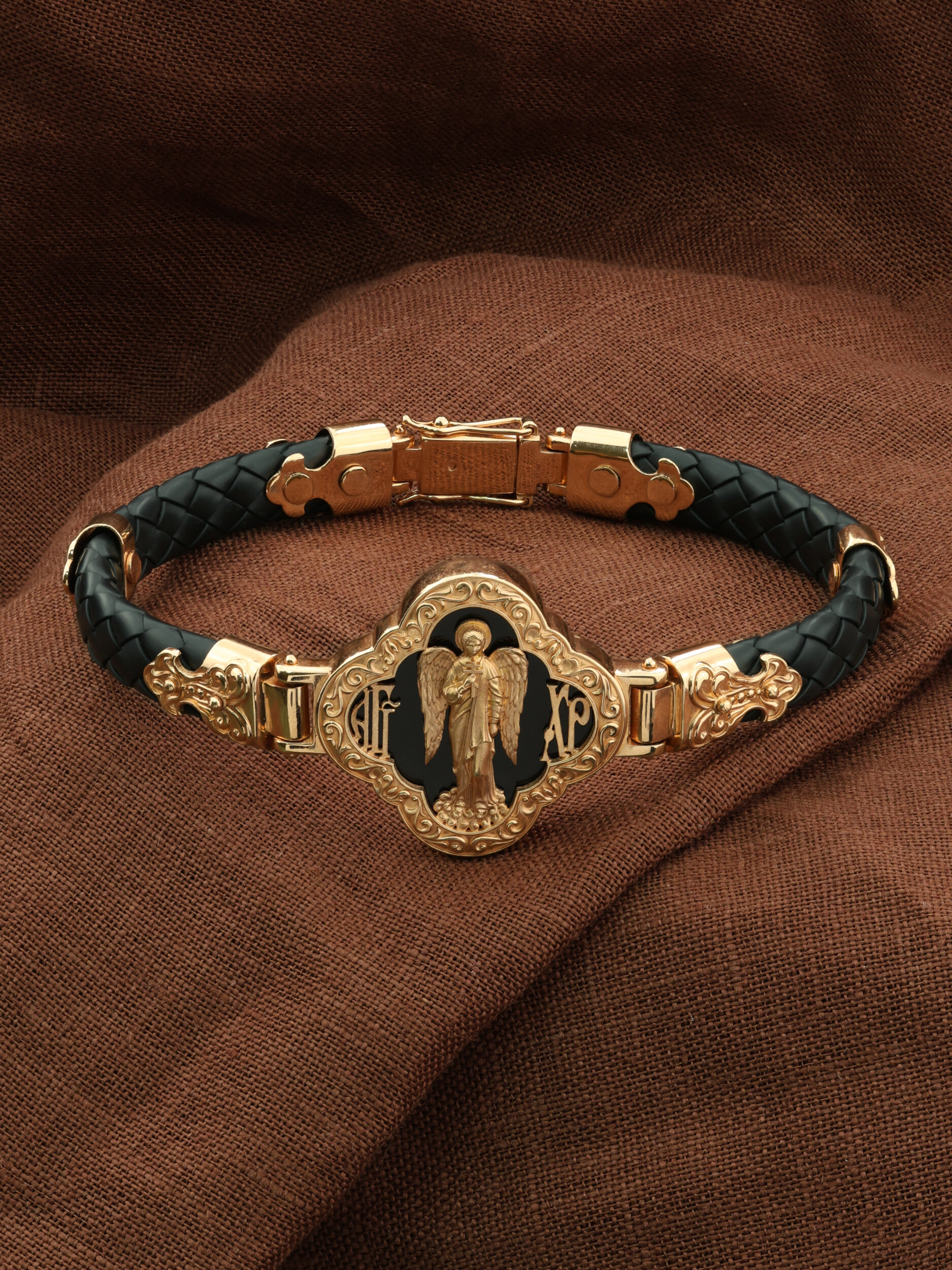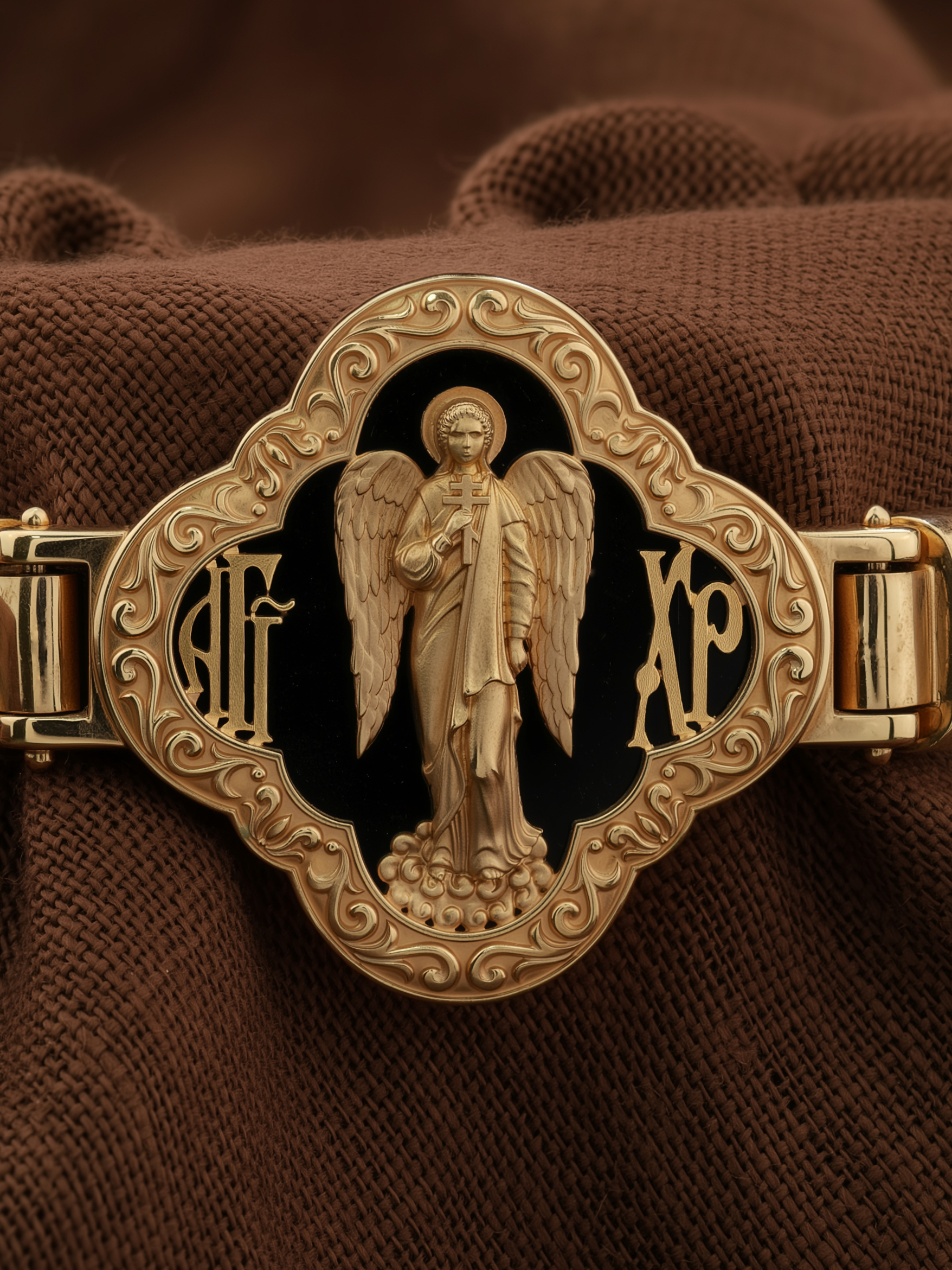 На лицевой стороне основного звена изображён Святой Ангел-Хранитель. Ангел Хранитель — это Ангел приставляемый Богом к человеку при крещении для охраны и помощи в добрых делах. Он невидимо находится при человеке на протяжении всей его жизни, если человек сохраняет в себе любовь к Богу и истинную веру перед Ним. Ангел-Xранитель делают для нас все, что служит к истинному нашему благу и спасению. Невидимо пребывая при нас постоянно, он, руководствуя нас ко спасению, не только по нашему желанию таинственно наставляет нас на все доброе и полезное, не только возносит наши молитвы к Богу, но еще и сам от себя охраняют и защищают нас от врагов видимых и невидимых и ходатайствует за нас пред Богом. Ангел-Хранитель так любит нас, как никто на земле любить не может. Ангел-Хранитель — присный друг наш, незримый тихий собеседник, пресладостный утешитель. Одного лишь каждому из нас он желает — спасения души; к этому он направляет все свои заботы. И если видит нас также заботящимися о спасении, радуется, если же видит нас пребывающими в нерадении о душе своей, скорбит.