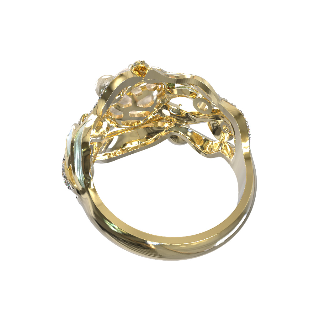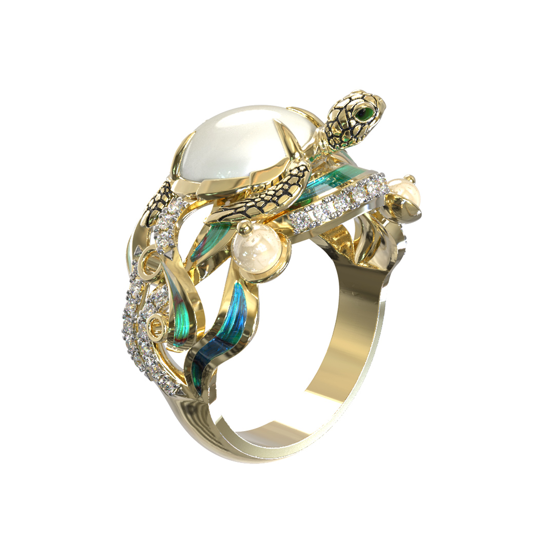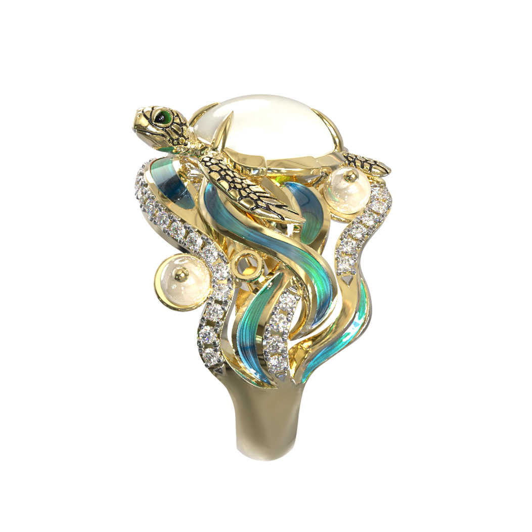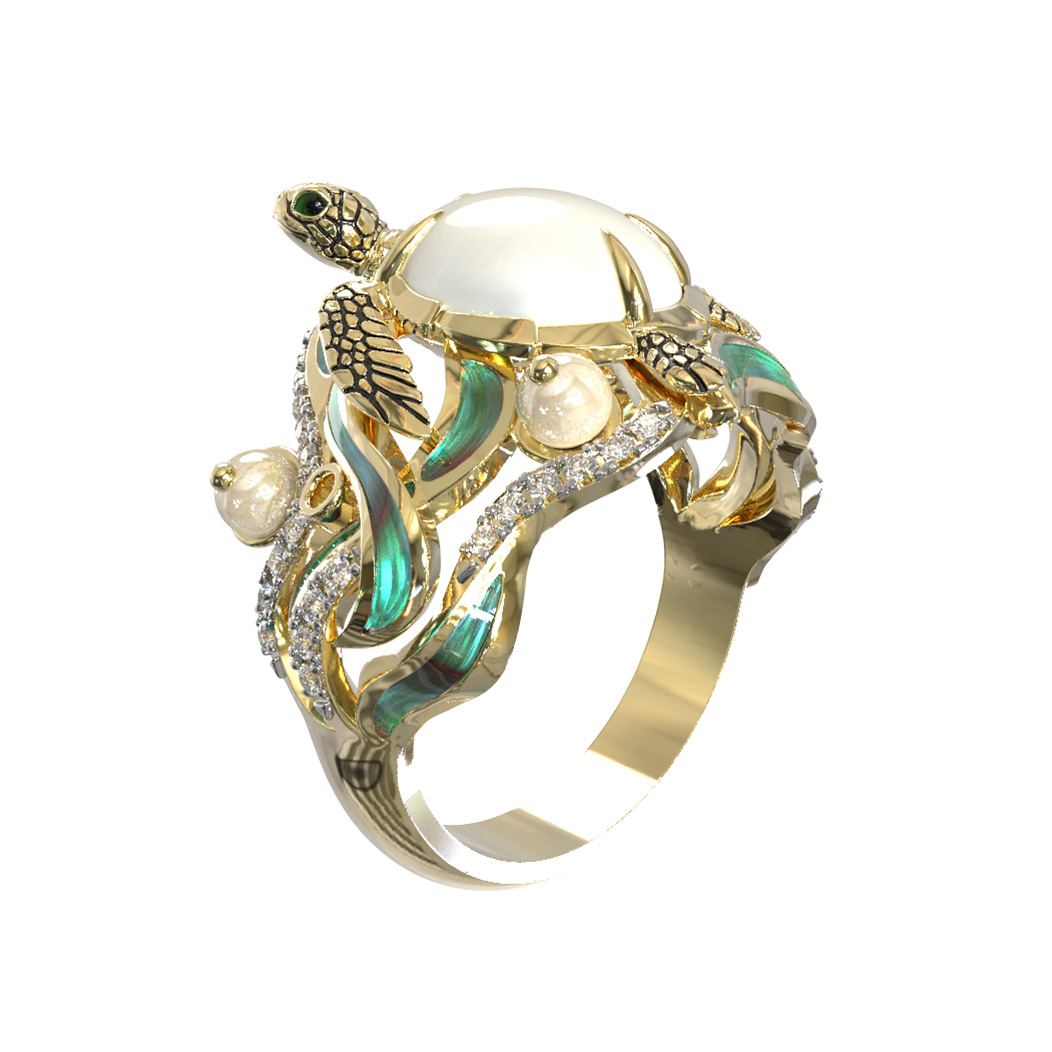 Кольцо из лимонного золота c эмаль, бриллиантами, жемчугом и перламутром