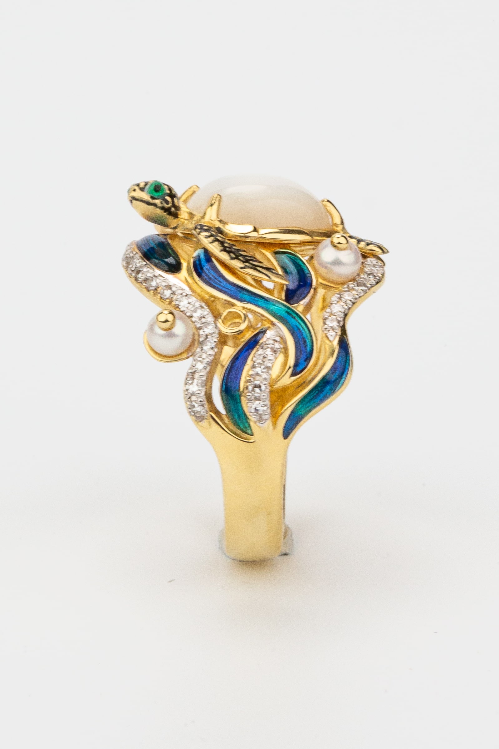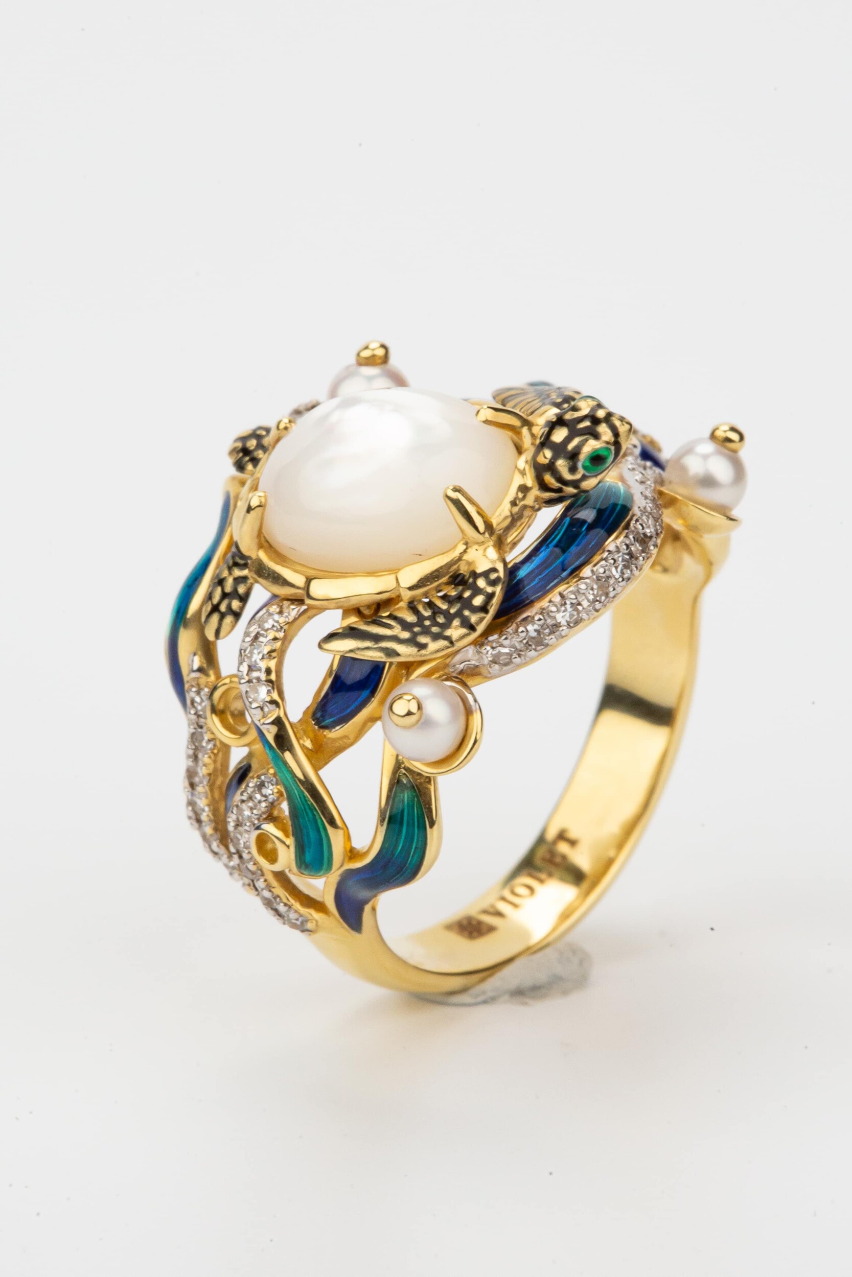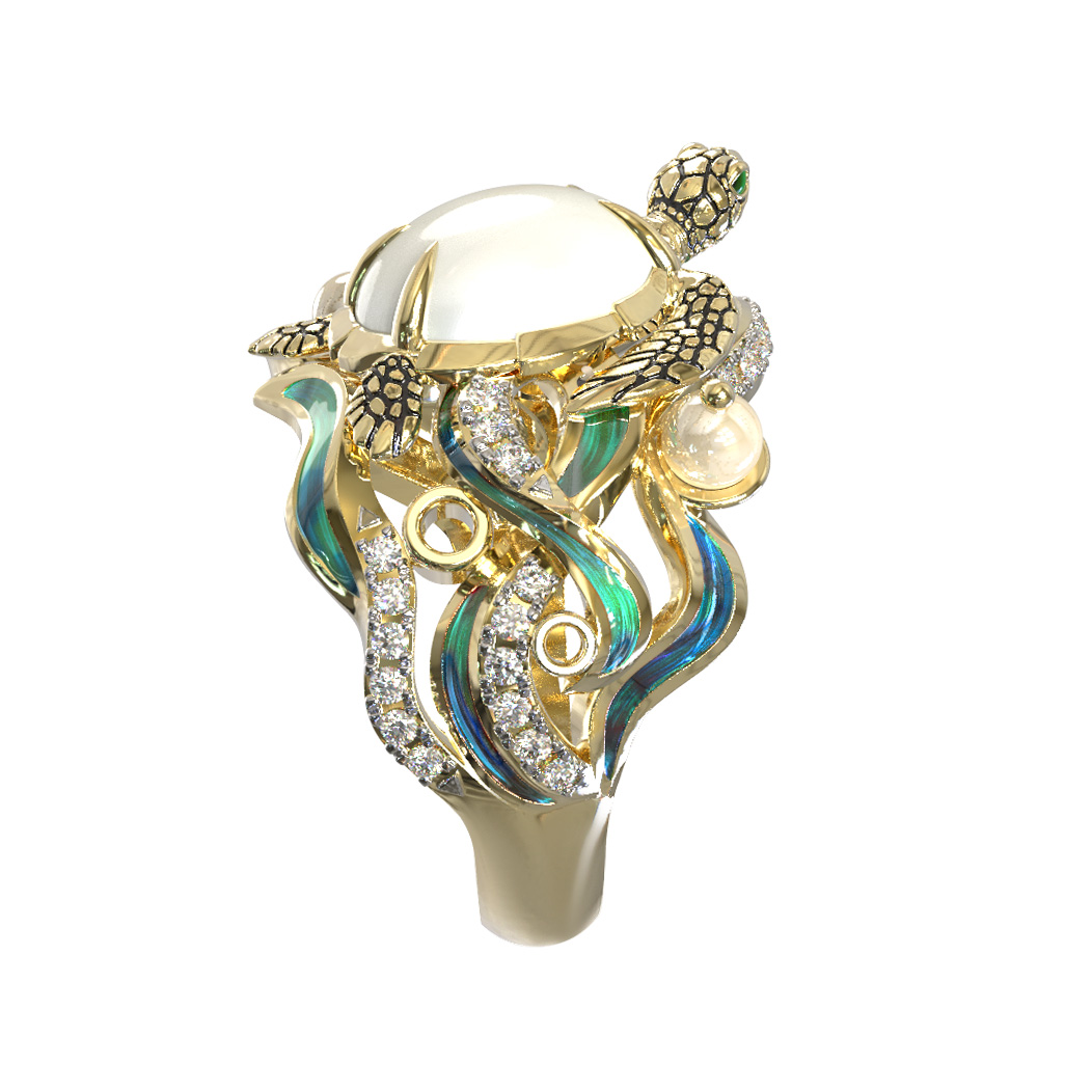 Кольцо из лимонного золота c эмаль, бриллиантами, жемчугом и перламутром