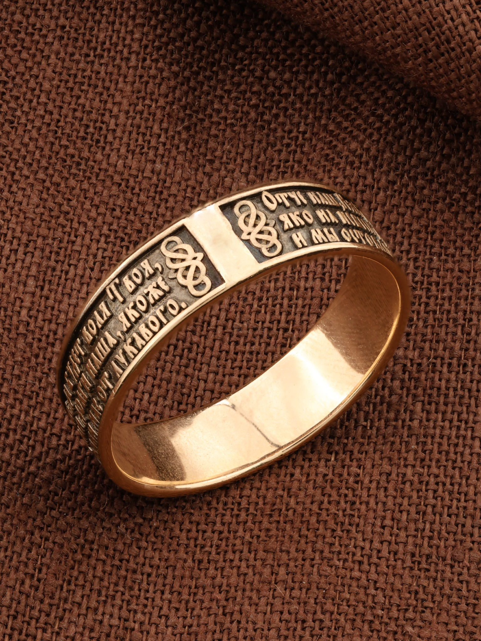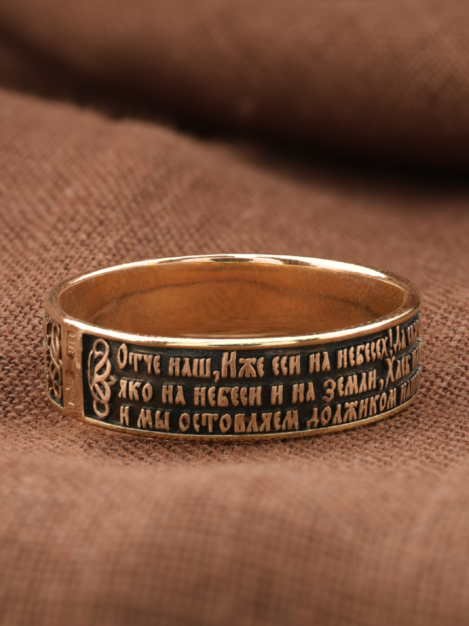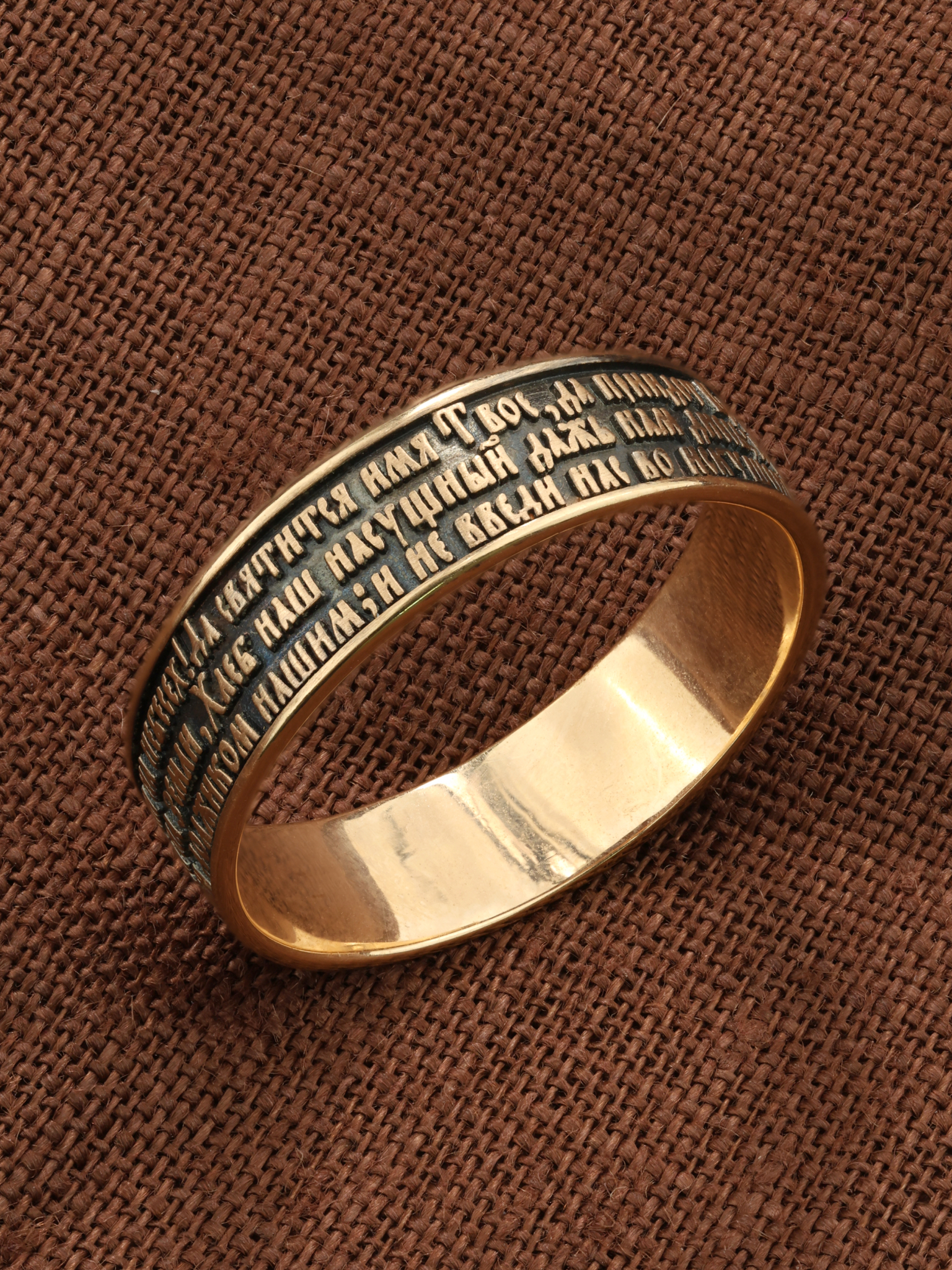 На лицевой стороне кольца отображена Божественная молитва к Богу Отцу, которую, Господь Иисус Христос дал своим ученикам. Молитва Господня приводится в Евангелиях в двух вариантах, более пространном в Евангелии от Матфея и кратком — в Евангелии от Луки. Различны и обстоятельства при которых Христос произносит текст молитвы. В Евангелии от Матфея «Отче наш» входит в состав Нагорной проповеди. Евангелист Лука пишет, что апостолы обратились к Спасителю: «Господи! Научи нас молиться, как и Иоанн научил учеников своих » (Лк. 11, 1). «Отче наш, Иже еси на небесе? х! Да святится имя Твое, да прии? дет Царствие Твое, да будет воля Твоя, яко на небеси? и на земли?. Хлеб наш насущный да? ждь нам дне? сь; и оста? ви нам до? лги наша, якоже и мы оставляем должнико? м нашим; и не введи нас во искушение, но изба? ви нас от лукаваго.»