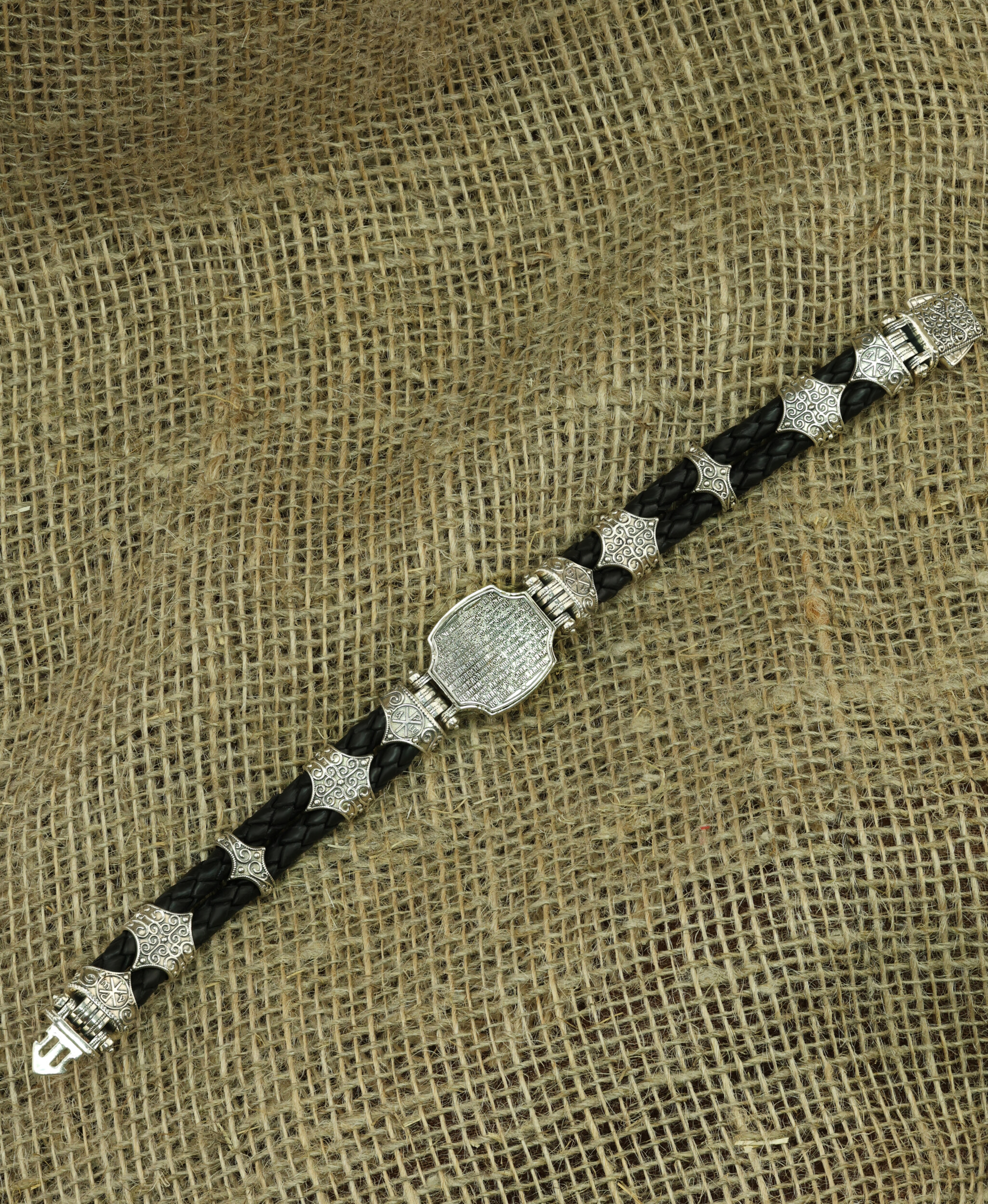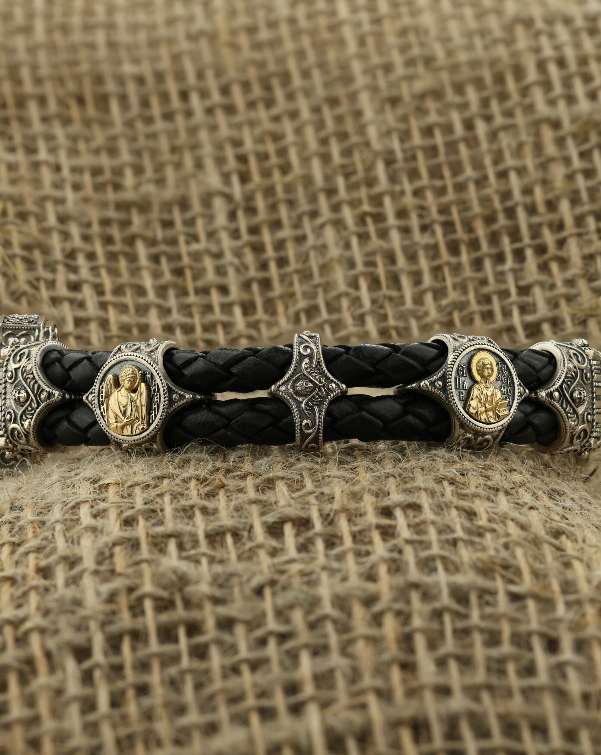 Браслет из серебра и золота c кожаным шнурком и ониксом