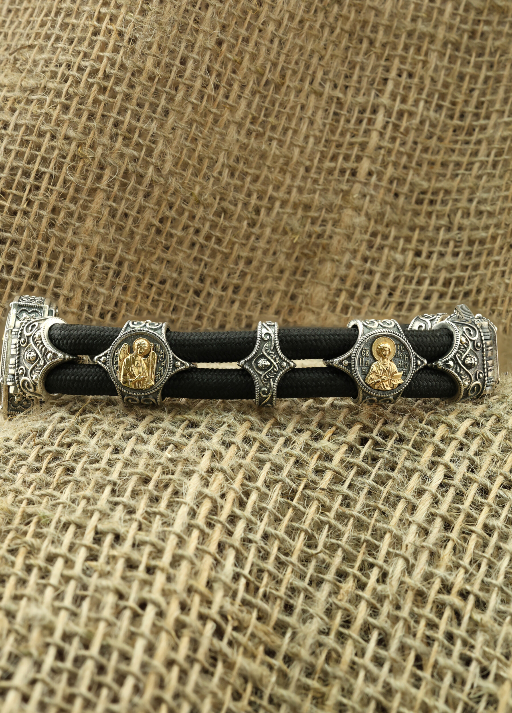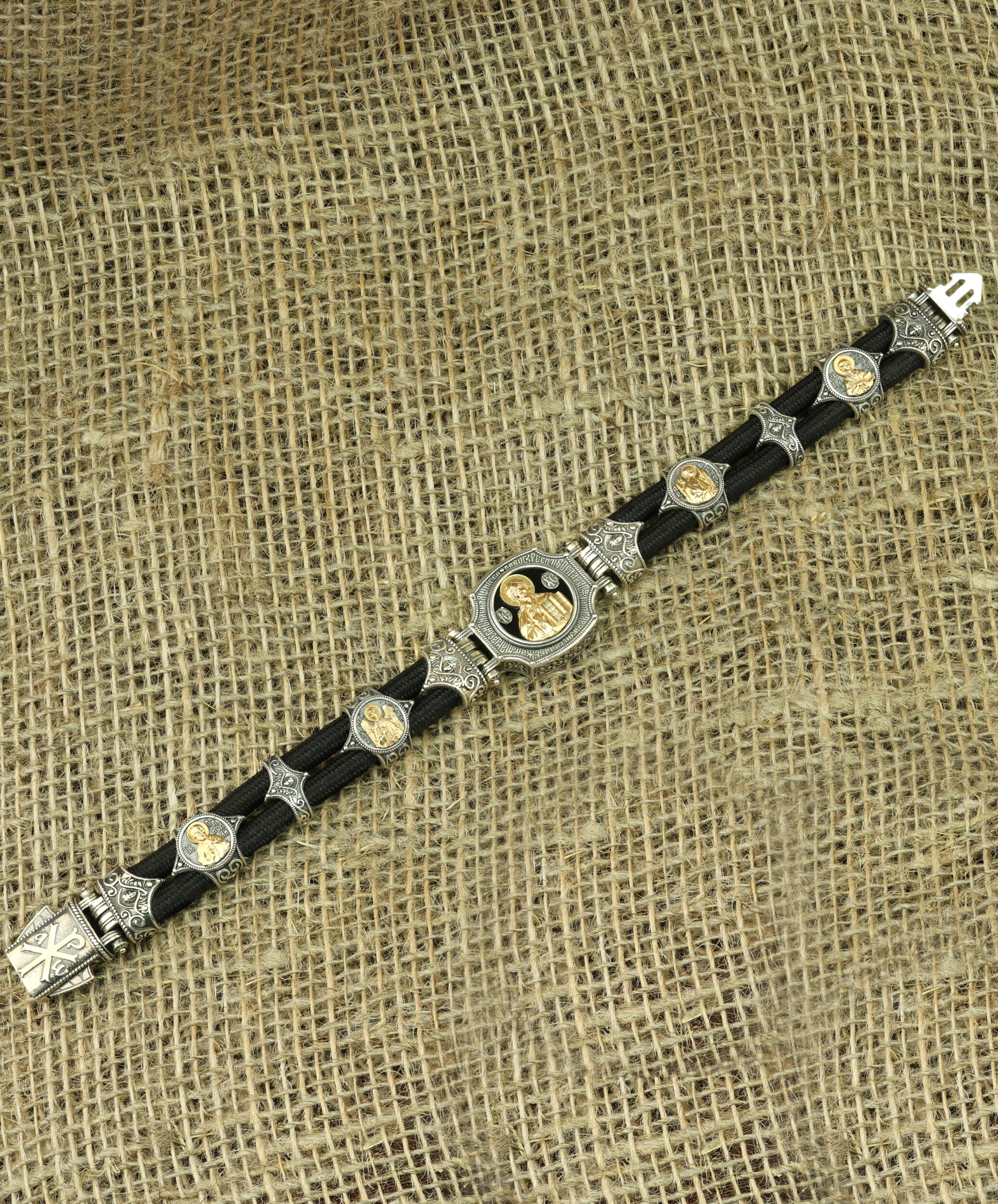 Браслет из серебра и золота c ониксом и шёлковым шнурком