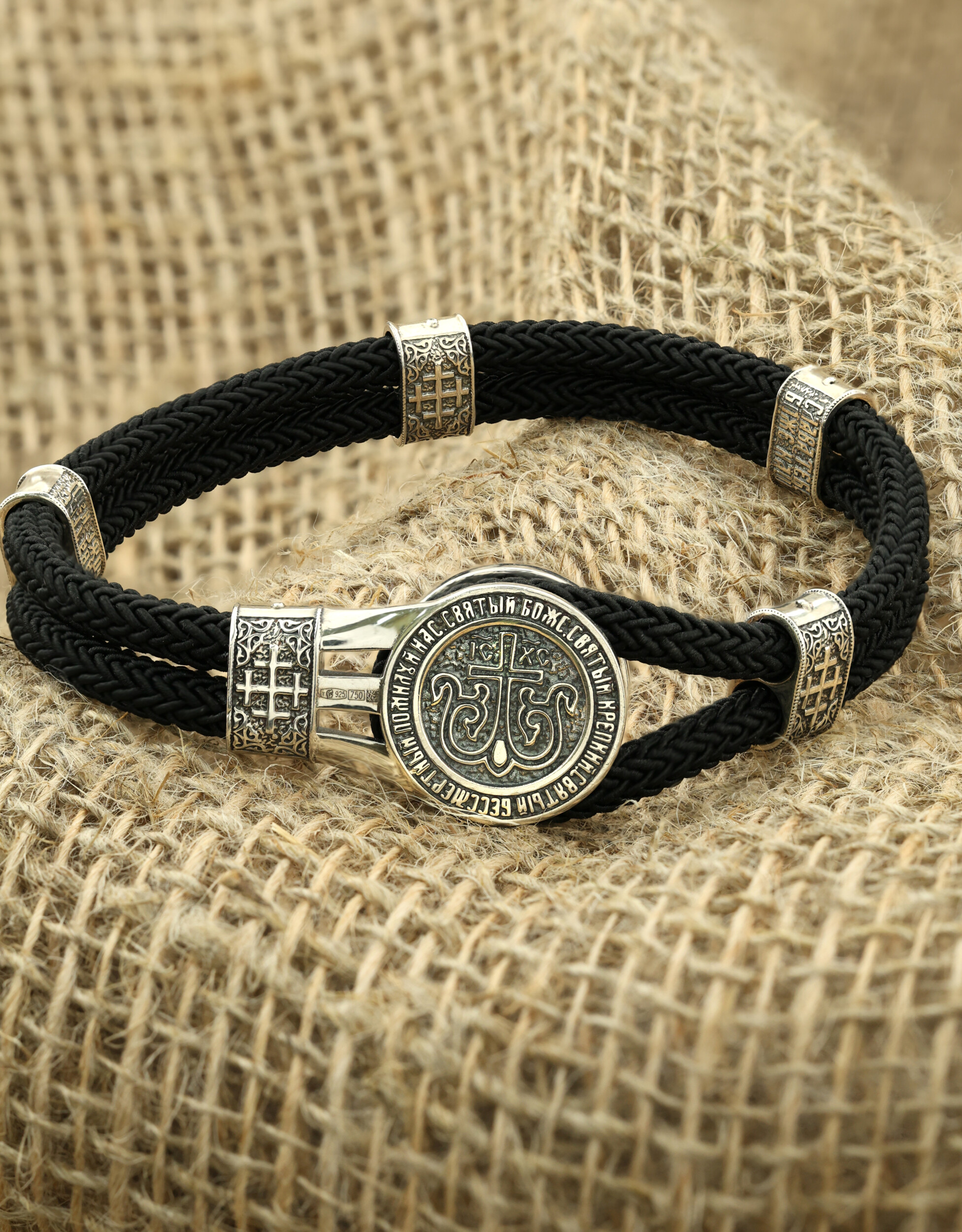 Браслет из серебра и золота c шёлковым шнурком