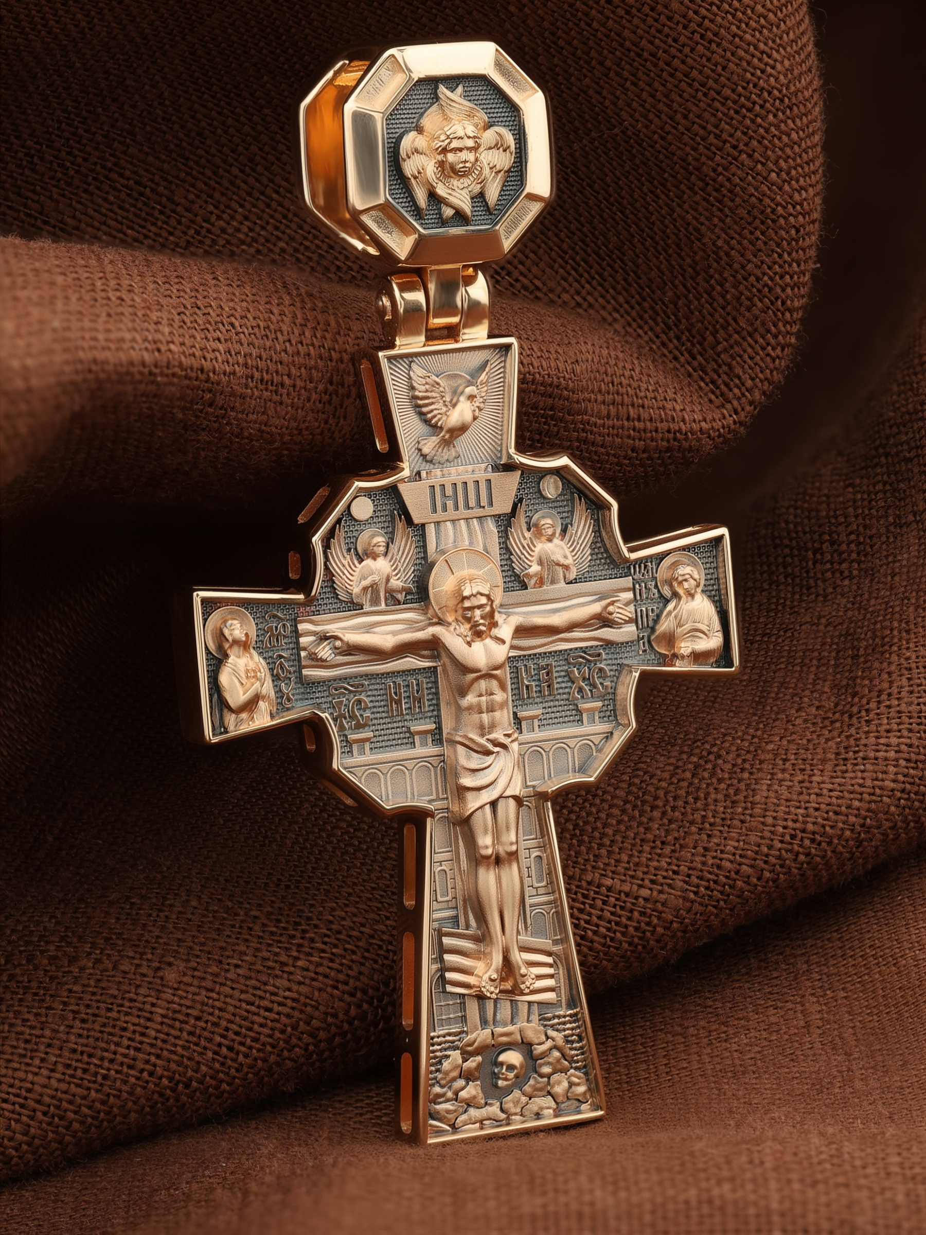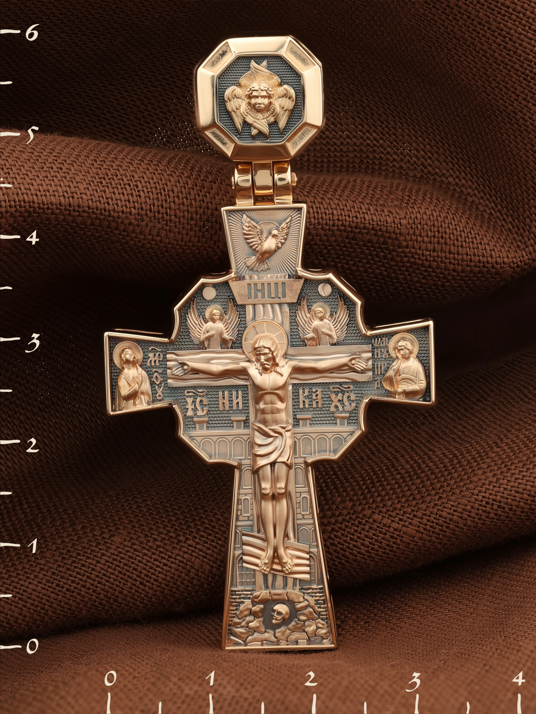 Над Распятием изображен парящий голубь — символ Святого Духа и Его благодати. На кулонном кольце изображен шестикрылый Серафим — самый приближенный к Господу Ангел.