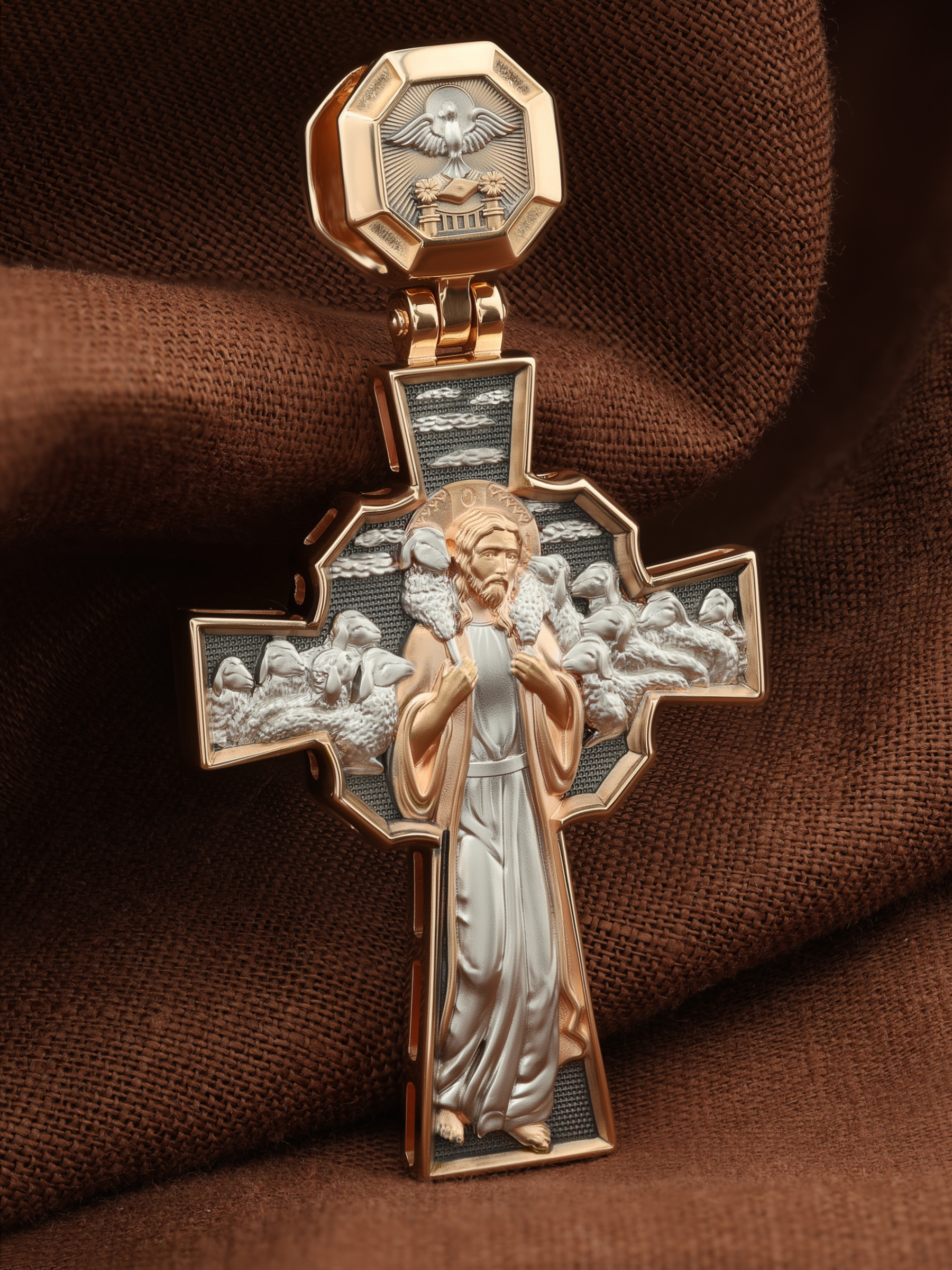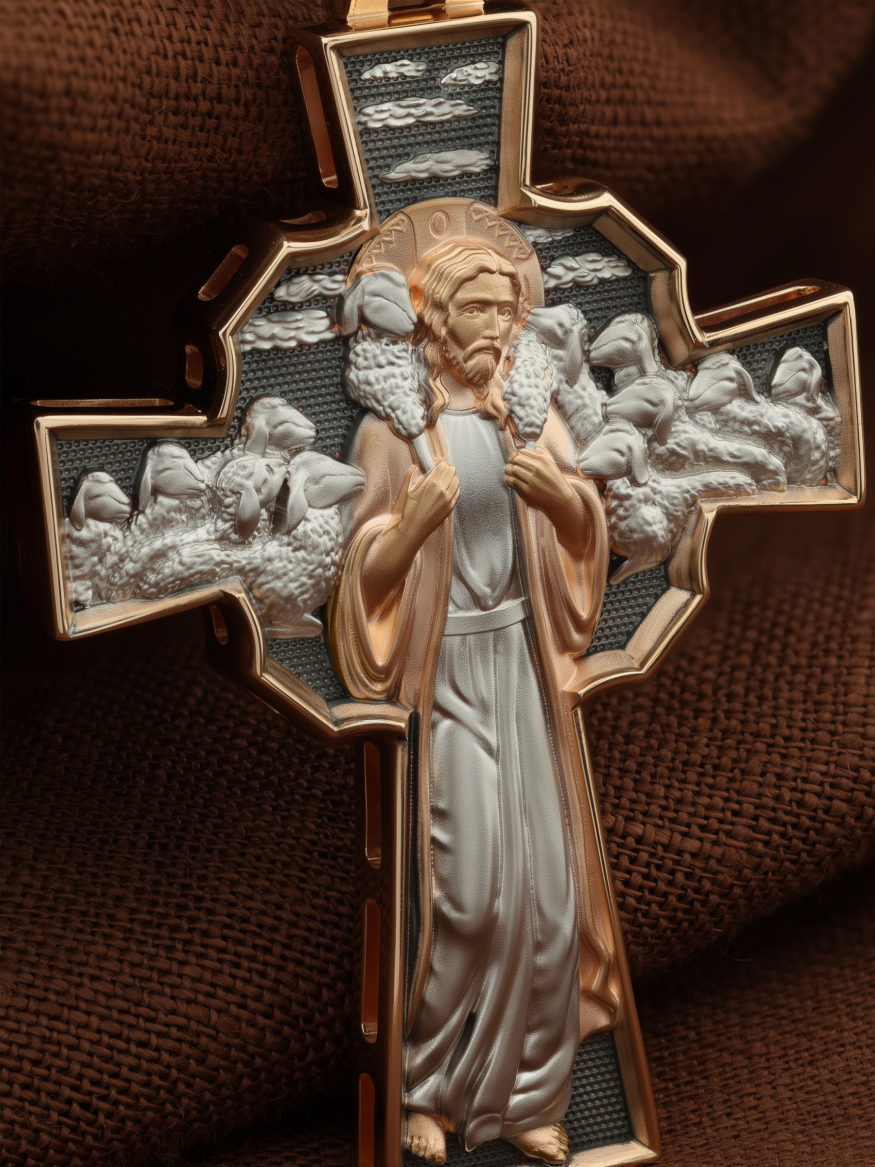 Но обратной стороне креста изображение Иисуса Христа. Добрый Пастырь — символическое именование и изображение Иисуса Христа, заимствованное из Ветхого Завета и повторенное Христом в Новом Завете в своей роли учителя. Иисус изображается с заблудшей овцой, вскинутой на плечи (Лк. 15:3−7).