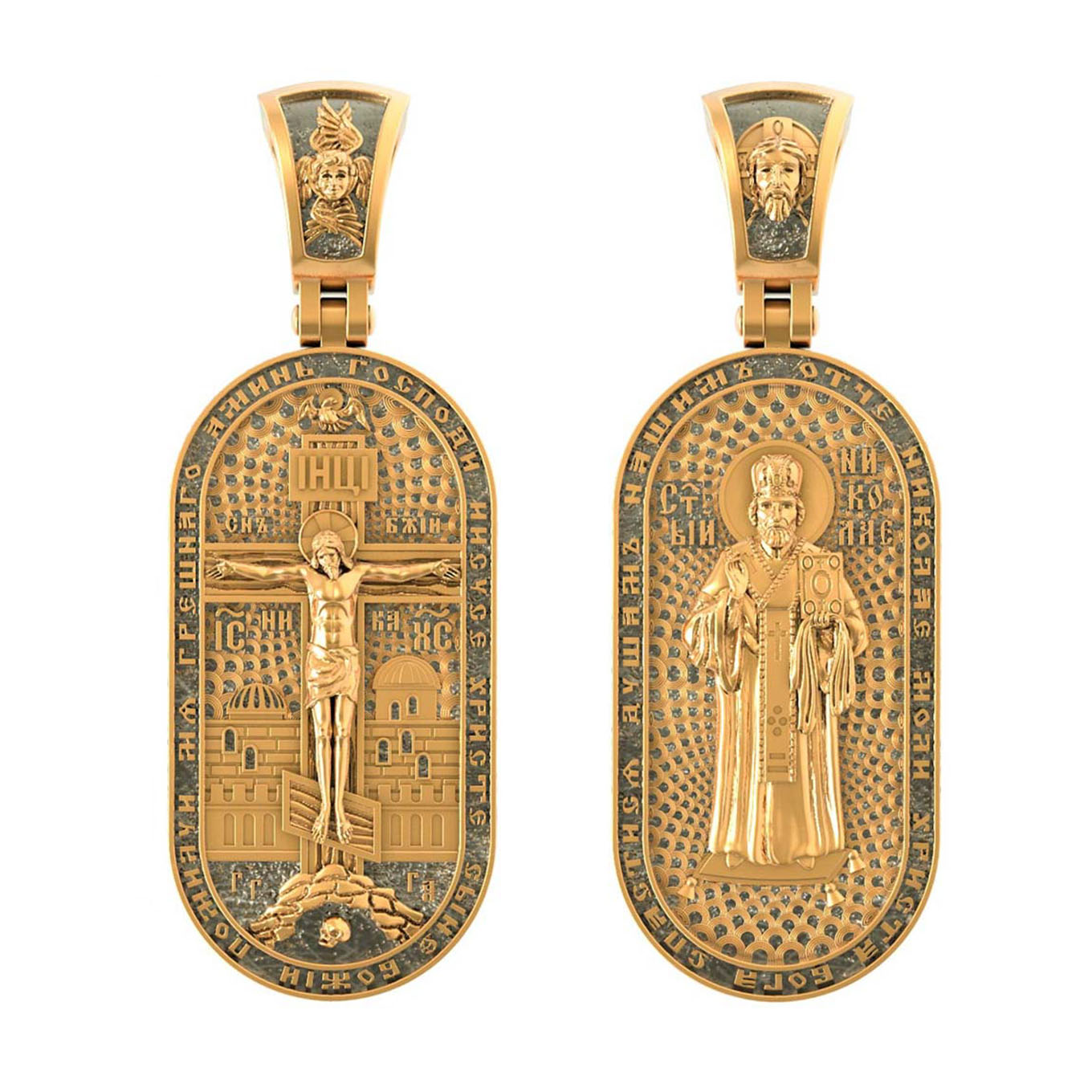 На оборотной стороне изображен Святой Николай Чудотворец, которого еще называют Николай Угодник — помощник в делах, покровитель учащихся, утешитель обиженных и нуждающихся, целитель самых страшных и тяжелых недугов, предстатель и молитвенник за людей перед Богом. Также Святитель Николай Чудотворец известен своими молитвами за путешественников, когда непрестанный ветер и бушующие волны утихают и корабль заходит в спокойную гавань. По контуру написана молитва: «Отче, Николай, моли Христа Бога спастися душам нашим». На кулонном кольце помещено изображение Спаса Нерукотворного.