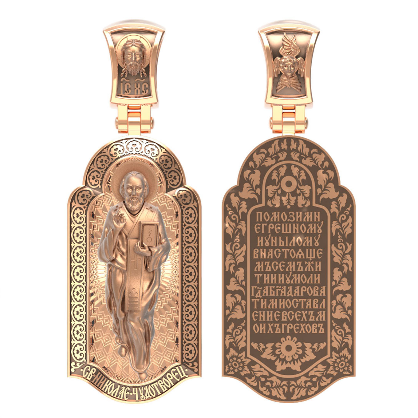 На лицевой стороне образка изображен Святитель Николай архиепископ Мир Ликийских, Чудотворец. Он является одним из самых почитаемых святых в православном мире. Избранник Божий Николай стал вершиной всех добродетелей. С кем из величайших праведников не сравнялся он образом духовной красоты, кому из них не последовал в своих деяниях и чудотворениях? Всеблаженный Николай был кроток, как Моисей, мужественен, как Давид, славен простотой нрава, как Иаков. Словно Ной, он спасал стадо Господне в новом ковчеге от потопа ересей. Вся жизнь святого Николая — это служение Богу. Много великих чудес сотворил на земле и на море великий Святитель Николай Угодник. Он укрощал штормы, спасал от потопления и выносил на сушу из глубины морской, освобождал из плена и приносил освобожденных домой, избавлял от уз и темницы, освобождал от смерти и подавал многим различные исцеления: слепым — прозрение, хромым — хождение, глухим — слух.