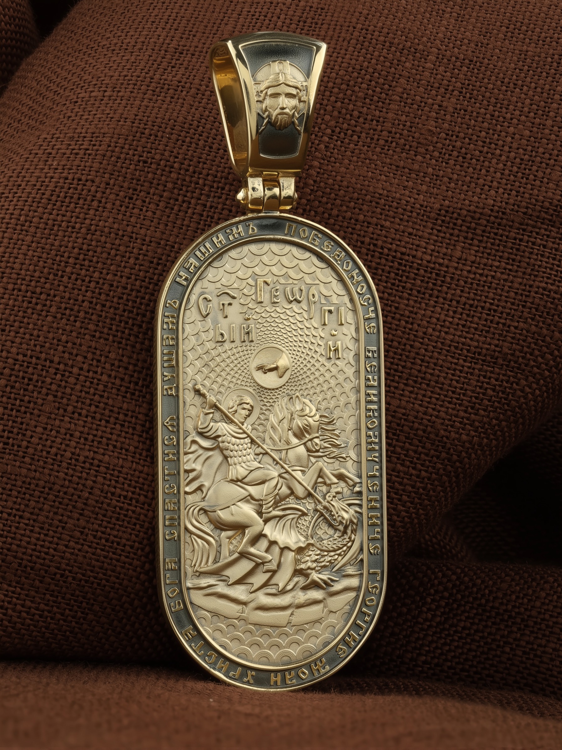 По контуру написана молитва: «Победоносче Великомучениче Георгие, моли Христа Бога спастися душам нашим». На кулонном кольце изображен Спас Нерукотворный — Символ вочеловечившегося Божества.