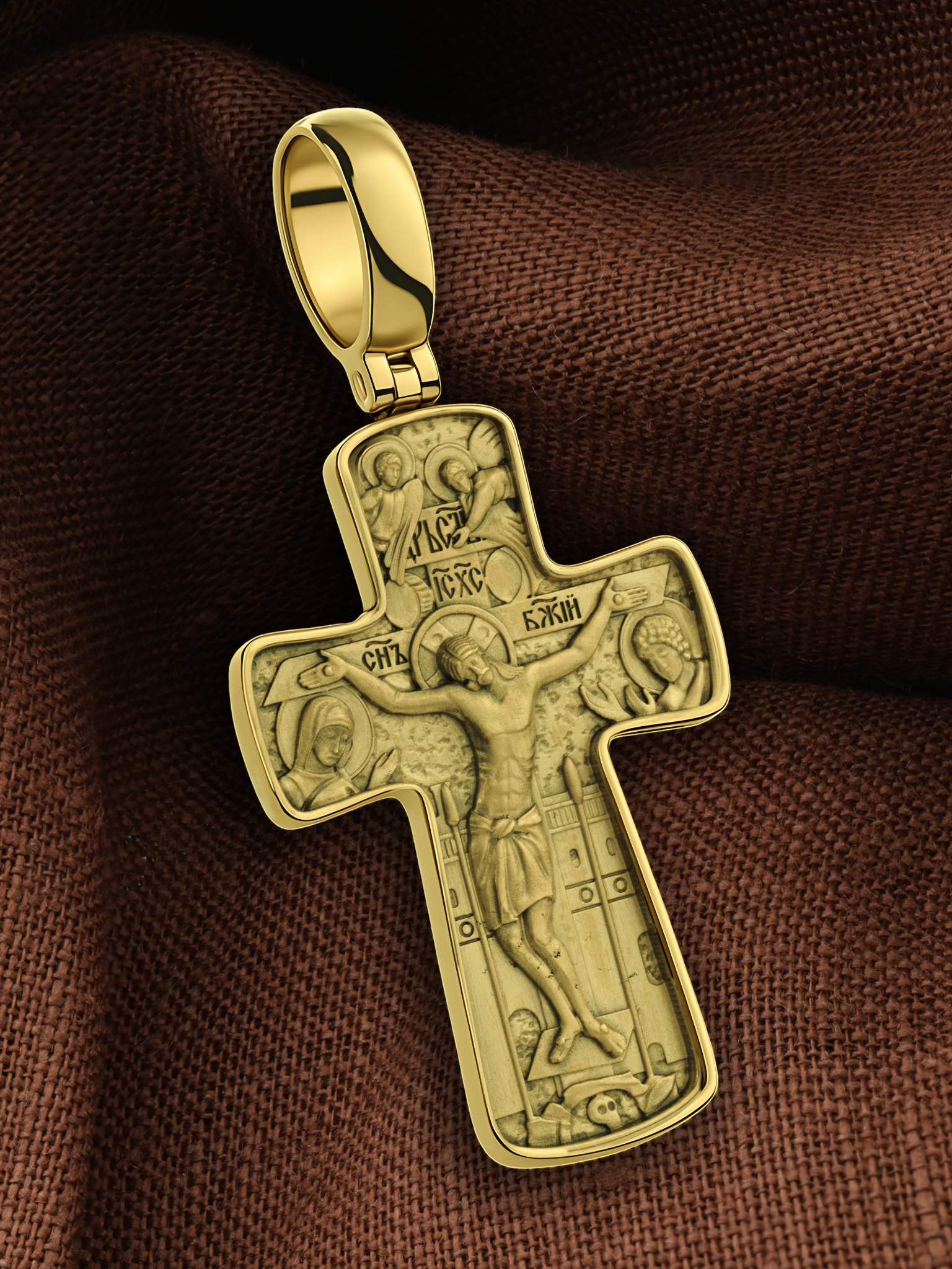 На лицевой стороне креста изображено Распятие Господа и Спасителя нашего Иисуса Христа. Крест- символ спасения и искупления рода человеческого, знамение победы над смертью и адом. Иисус Христос, как искупительная жертва освобождения человечества от власти греха, умер крестной смертью и в третий день воскрес. Господь сказал: кто хочет идти за Мною, отвергнись себя, и возьми крест свой, и следуй за Мною. (Мк. 8: 34). Над вершиной Распятия помещена надпись «Царь Славы». На верхней табличке, выше головы Иисуса, расположена надпись, составленная Понтием Пилатом — «IНЦI». Надпись «IС» « ХС» означает Иисус Христос и помещается на разных сторонах поперечной перекладины креста. Рядом расположена надпись «Сын Божий». Над Распятием изображены ангелы. Слева от Распятия изображена Пресвятая Богородица, справа — апостол и евангелист Иоанн Богослов, один из ближайших учеников Иисуса Христа. Крест стоит на горе камней, символизирующих Голгофу. В ее основании различается череп — это голова Адама. Вдоль креста изображены копие сотника Лонгина и трость с губкой.