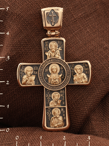 На лицевой стороне креста изображено Распятие Господа Иисуса Христа с предстоящими Ему святыми, которые, по преданию, находились у Креста Господа во время Его казни. Слева — Пресвятая Богородица и жены-мироносицы — равноапостольная Мария Магдалина и святая Мария Клеопова, справа — апостол Иоанн Богослов, прав. Иосиф Аримофейский и мч. Лонгин Сотник.