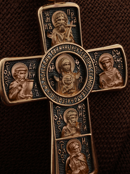 Центральную часть оборота креста украшает икона Божией Матери «Знамение». Вокруг Ее образа написана молитва: «Ныне к Тебе прибегаю, Пресвятая Дева, спаси мя мольбами Твоими».