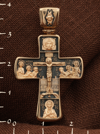 На лицевой стороне креста изображено Распятие Господа Иисуса Христа с предстоящими Ему святыми, которые, по преданию, находились у Креста Господа во время Его казни. Слева — Пресвятая Богородица и жены-мироносицы — равноапостольная Мария Магдалина и святая Мария Клеопова, справа — апостол Иоанн Богослов, прав. Иосиф Аримофейский и мч. Лонгин Сотник.