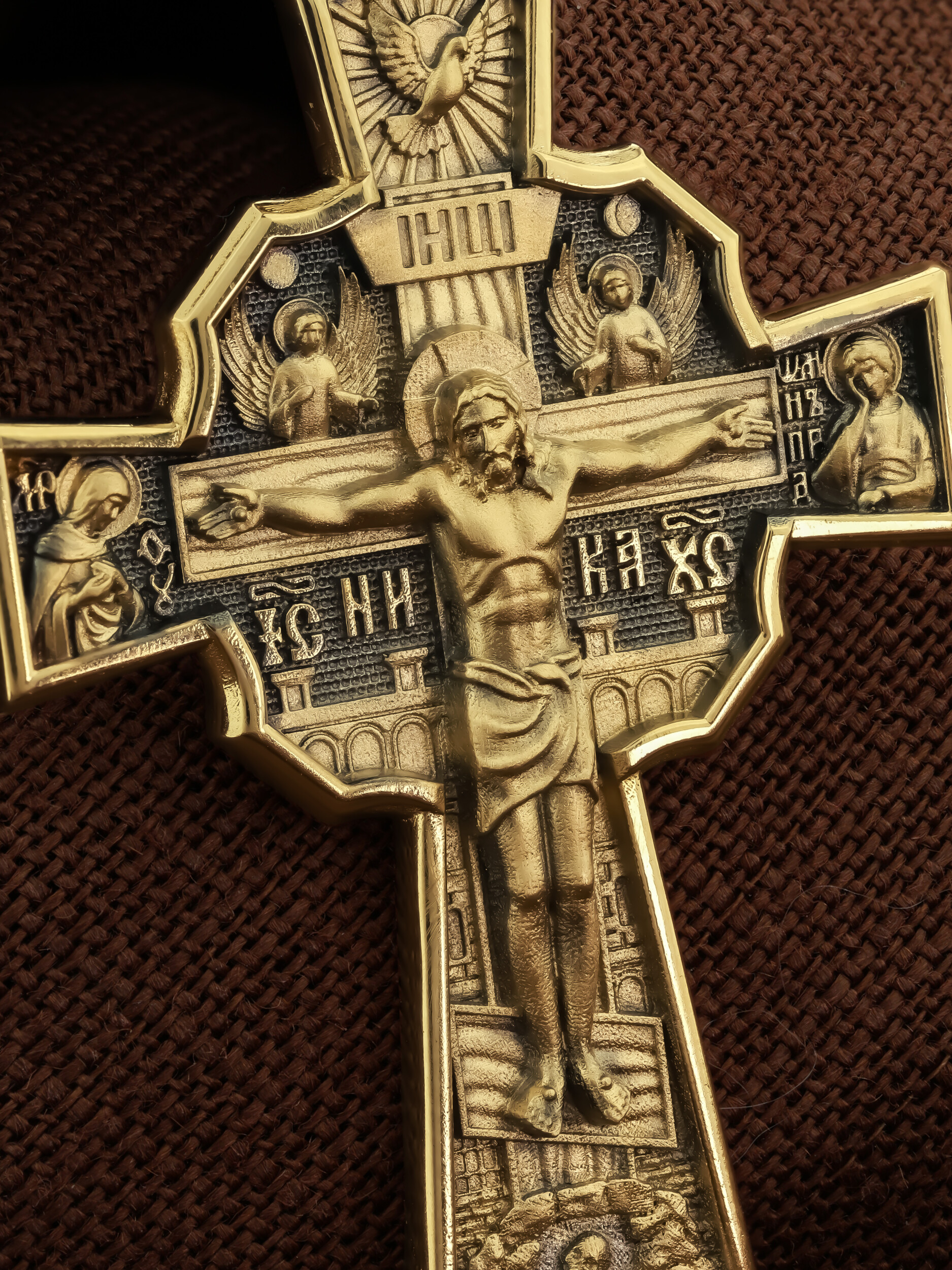 На лицевой стороне креста изображено Распятие Господа и Спасителя нашего Иисуса Христа, отдавшего Себя на смерть, для искупления грехов мира. Верхняя перекладина символизирует титло — табличку, на которой, согласно Евангелию, было начертано: Иисус Назорей Царь Иудейский (IНЦI). Распятие сопровождается надписями, олицетворяющими Христа. Надпись «IС» « ХС», что означает Иисус Христос, и слово «НИКА», что означает «победитель», помещаются ниже поперечной перекладины креста. Над вершиной Распятия помещено изображение Святого Духа, в виде голубя сходящего с небес, и двух Ангелов. Слева от Распятия изображена Пресвятая Богородица, справа — апостол и евангелист Иоанн Богослов, один из ближайших учеников Иисуса Христа. За крестом высится Иерусалимская стена, в знак того, что Господь был распят вне стен города. Возвышение, на котором стоит Крест, символизирует гору Голгофу, на которой произошло Распятие. Под подножием Креста изображена покоящаяся голова (череп) Адама. На кулонном кольце помещено изображение шестикрылого Серафим.