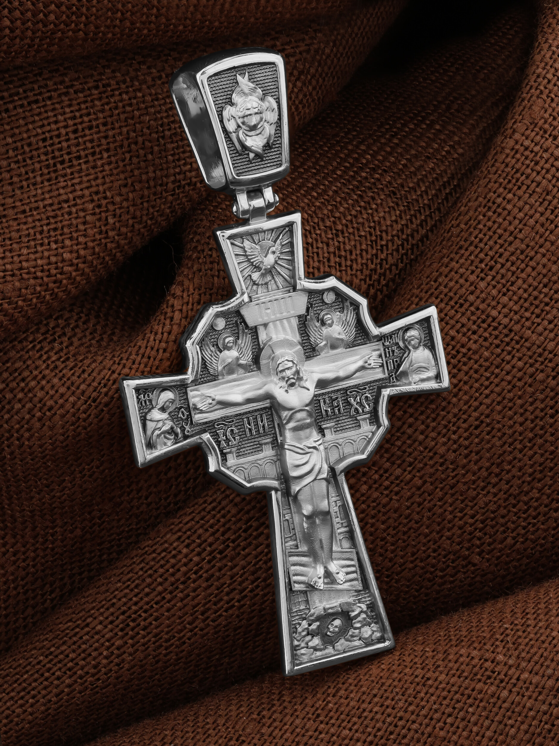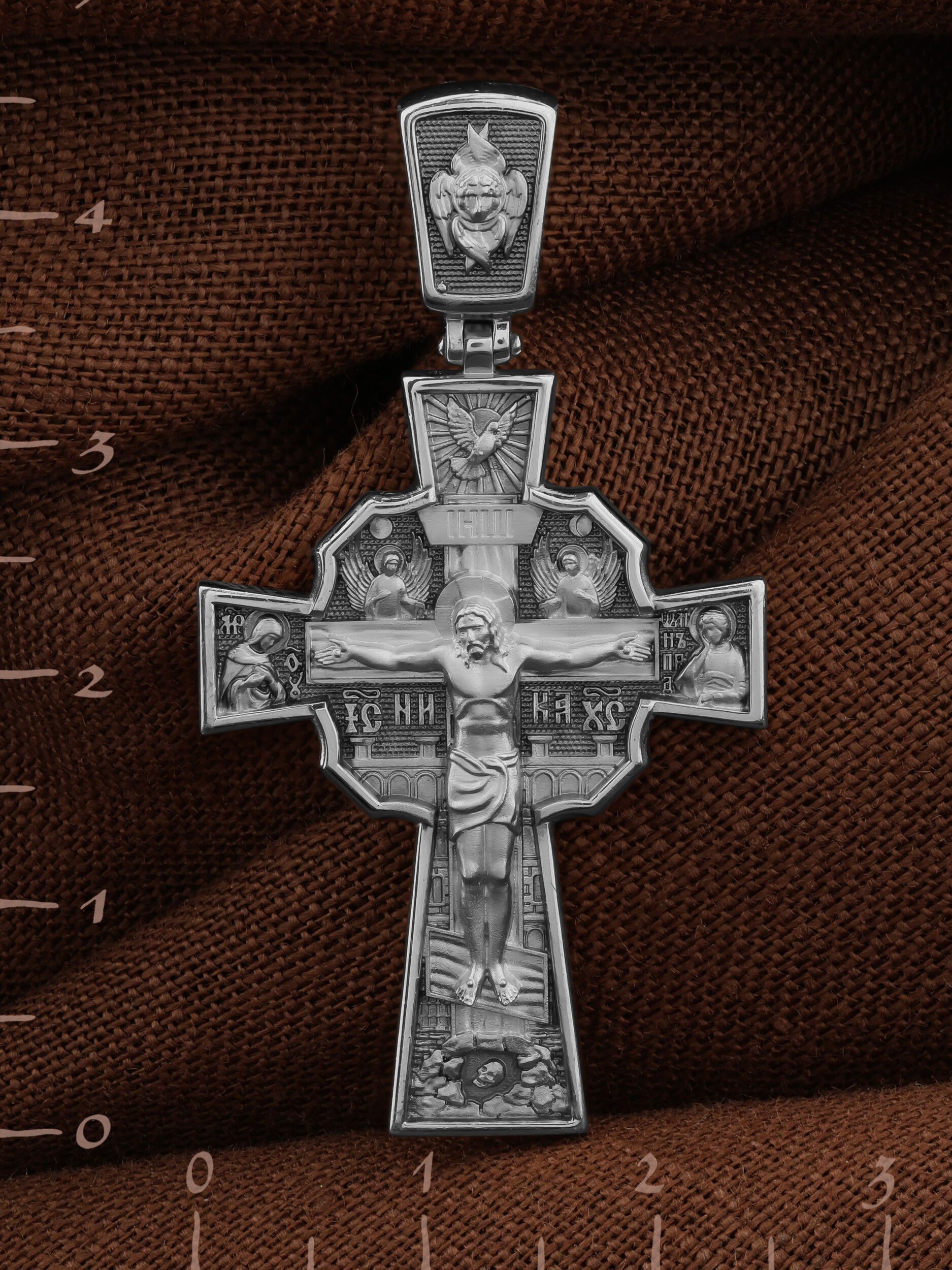 На лицевой стороне креста изображено Распятие Господа и Спасителя нашего Иисуса Христа, отдавшего Себя на смерть, для искупления грехов мира. Верхняя перекладина символизирует титло — табличку, на которой, согласно Евангелию, было начертано: Иисус Назорей Царь Иудейский (IНЦI). Распятие сопровождается надписями, олицетворяющими Христа. Надпись «IС» « ХС», что означает Иисус Христос, и слово «НИКА», что означает «победитель», помещаются ниже поперечной перекладины креста. Над вершиной Распятия помещено изображение Святого Духа, в виде голубя сходящего с небес, и двух Ангелов. Слева от Распятия изображена Пресвятая Богородица, справа — апостол и евангелист Иоанн Богослов, один из ближайших учеников Иисуса Христа. За крестом высится Иерусалимская стена, в знак того, что Господь был распят вне стен города. Возвышение, на котором стоит Крест, символизирует гору Голгофу, на которой произошло Распятие. Под подножием Креста изображена покоящаяся голова (череп) Адама. На кулонном кольце помещено изображение шестикрылого Серафим.